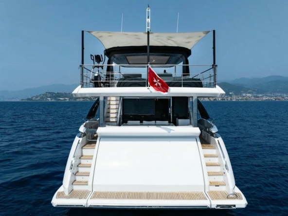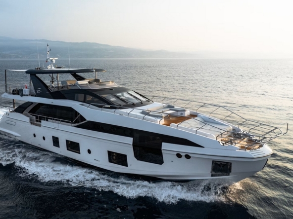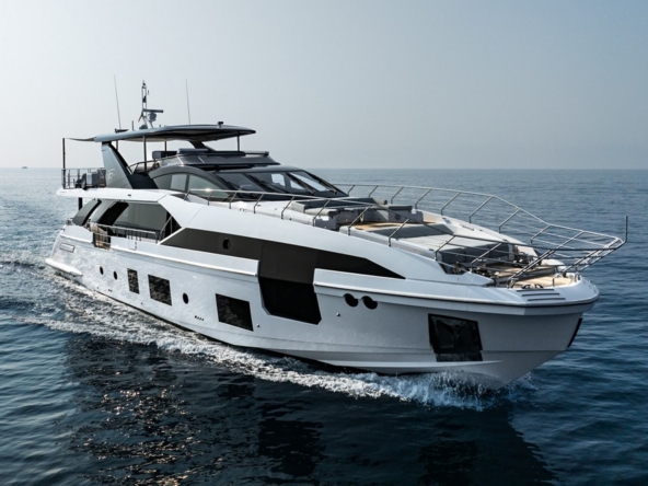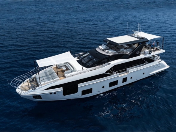 L’élégance du style italien épuré de ce yacht, signé Stefano Righini, fait une impression inoubliable. Sa ligne raffinée lui confère une touche moderne et sophistiquée. Construit en polyester avec superstructures en carbone par le chantier italien Azimut Yachts, c’est un bateau robuste, marin et très confortable.