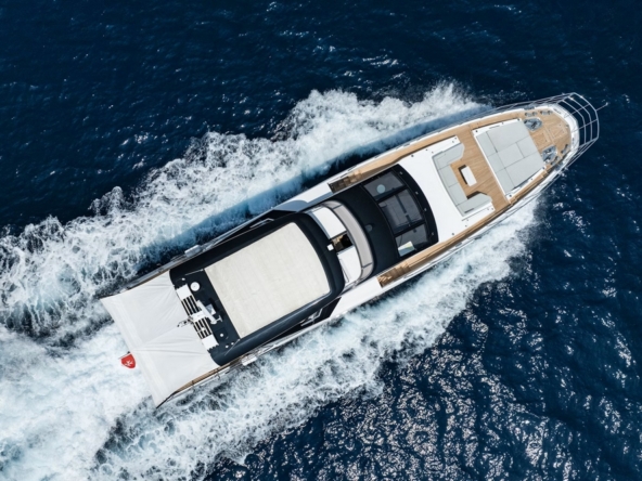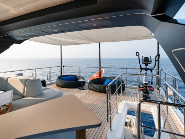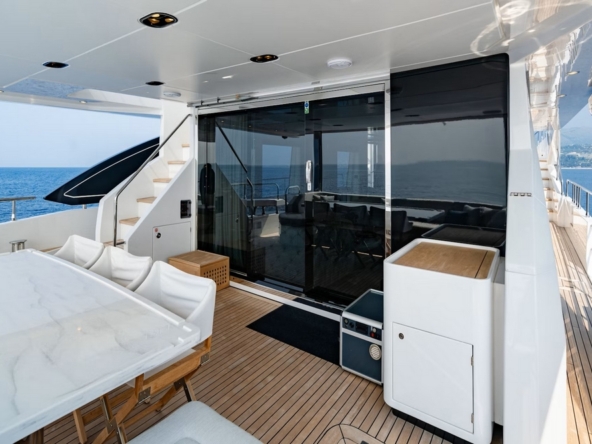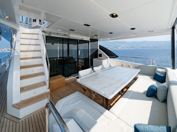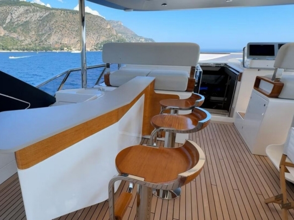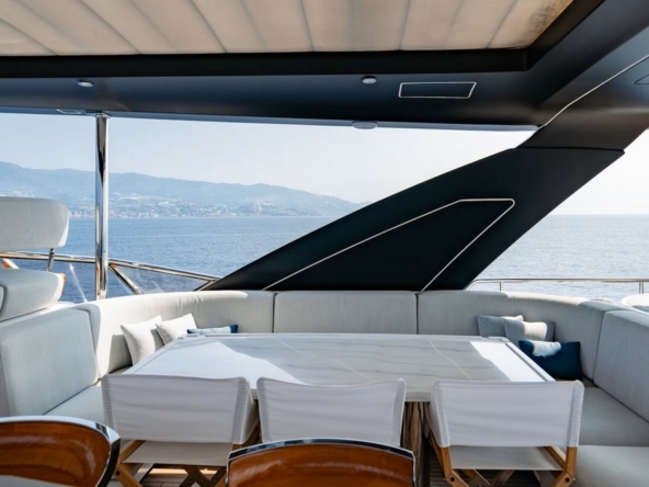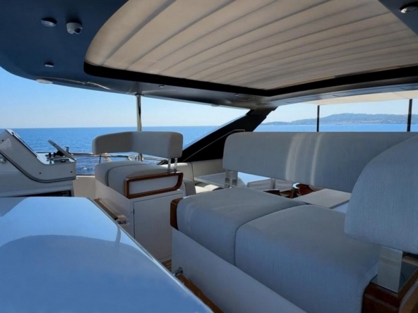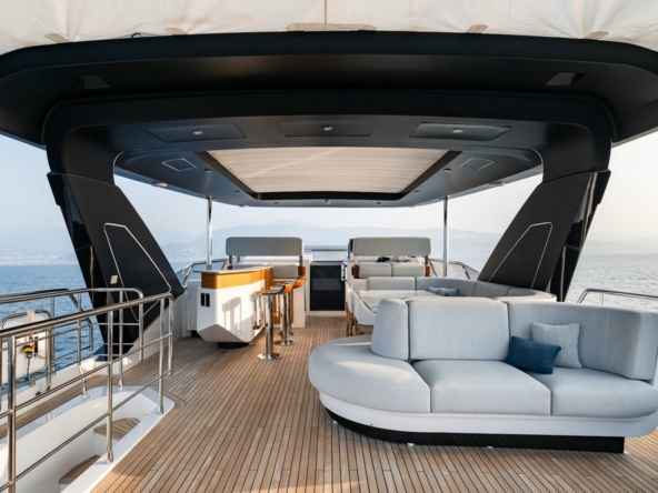 Le spacieux flybridge est aménagé avec deux grands fauteuils, une machine de fitness, et un canapé à l’arrière. Au milieu, un salon/salle à manger avec banquette en U et trois fauteuils pliant autour d’une table, fait face au bar équipé d’un évier, d’un grill, d’un réfrigérateur, d’une machine à glaçons et de trois tabourets. Cet espace est ombragé par un hard-top en carbone avec toit ouvrant intégré et par un auvent tendu entre cet hard-top et trois poteaux en carbone, sur la partie arrière. Le poste de pilotage est à l’avant tribord et une banquette biplace est à bâbord.