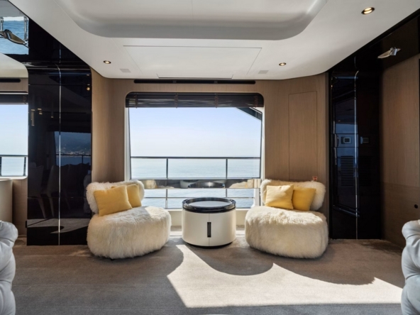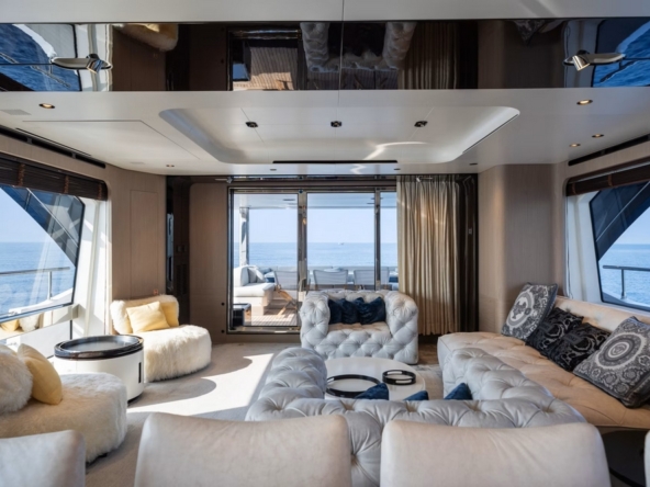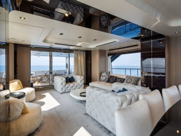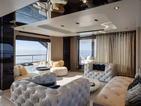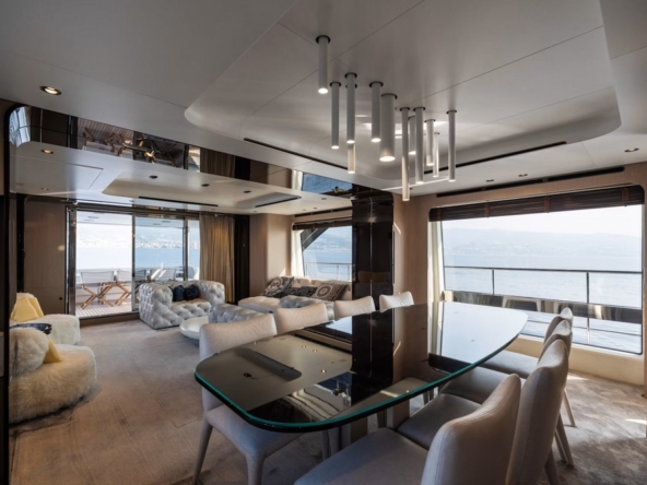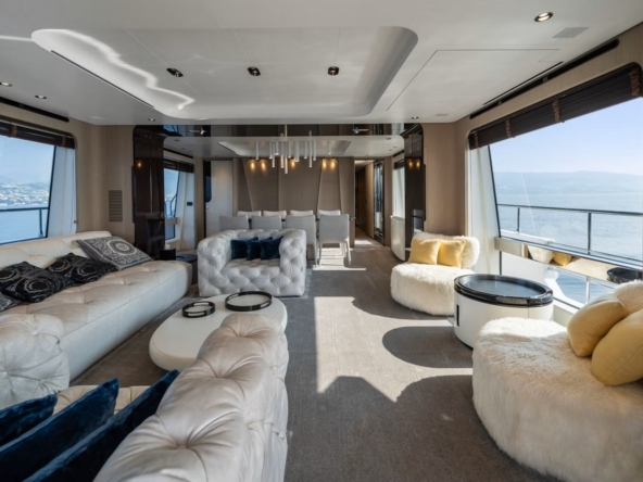 L’intérieur du pont principal, accessible par la grande baie vitrée coulissante, est baigné de lumière naturelle grâce aux immenses fenêtre latérales allant du sol au plafond. L’agencement, conçu par Achille Salvagni, est luxueux, alliant confort et raffinement. Le souci du détail est omniprésent avec tissus et finitions haut de gamme.