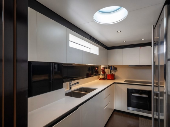 La cuisine fermée, située sur bâbord, est accessible par une porte coulissante. Elle est moderne, toute blanche, avec plan de travail en composite et deux éviers en inox, plaque à induction quatre feux et hotte aspirante, four électrique, lave-vaisselle, réfrigérateurs de 420 litres, congélateur de 250 litres, et cave à vins.