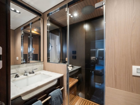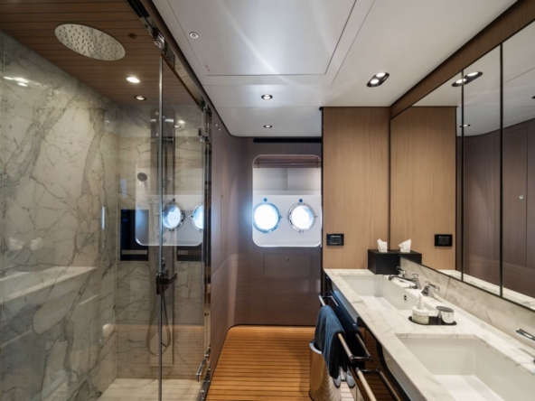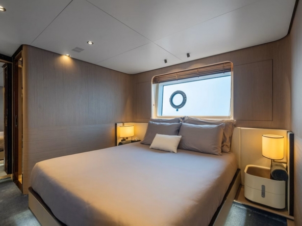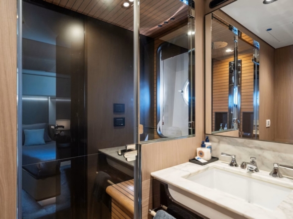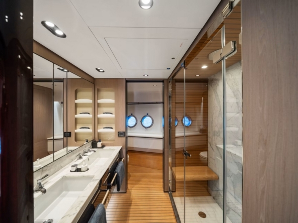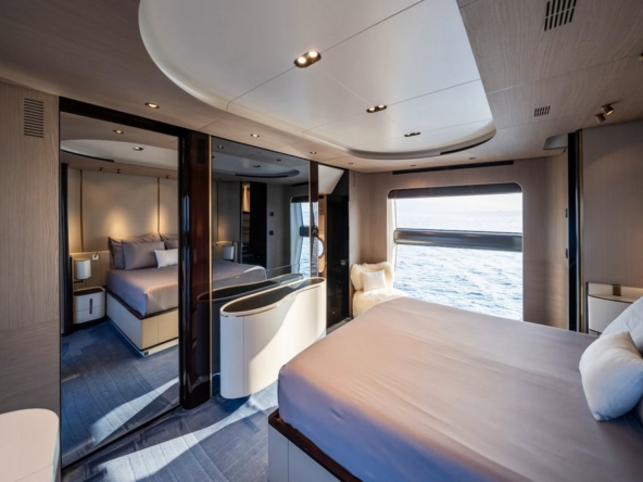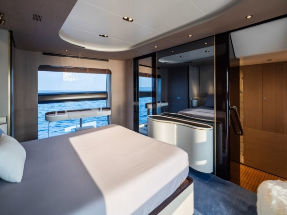 Une toilette de jour se trouve dans la coursive menant à la suite du propriétaire. Elle est vaste, sur toute la largeur, et bénéficie de grandes fenêtres latérales du sol au plafond. Elle est aménagée avec un lit king-size, une coiffeuse, un fauteuil, un dressing, un téléviseur LG 55” avec Apple TV, des enceintes Bose Lifestyle, et d’une salle de bain attenante avec des finitions en marbre.