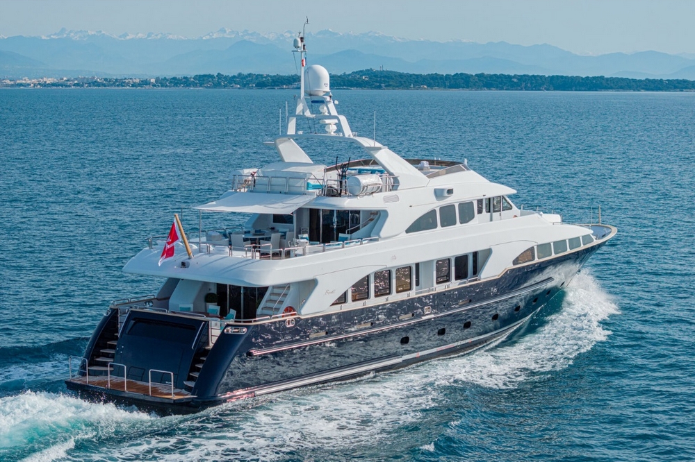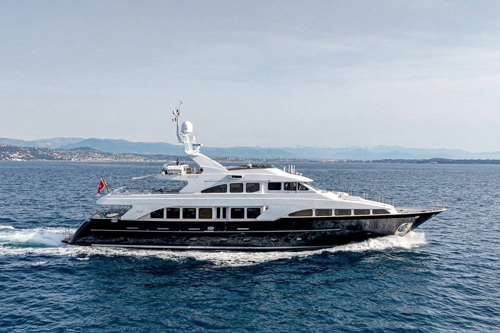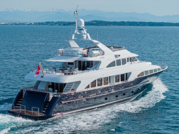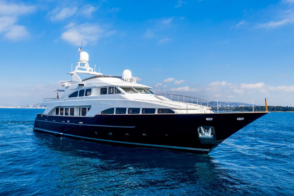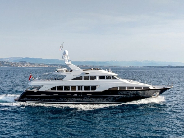 Yacht à trois ponts, très spacieux et de grande qualité. Conçu par Stefano Righini, sa ligne classique et intemporelle est mise en valeur par le contraste de sa coque bleu marine et de ses superstructures d’un blanc éclatant. C’est un vrai navire de haute mer robuste, marin, et luxueux, construit en polyester par le talentueux chantier Benetti Yachts.