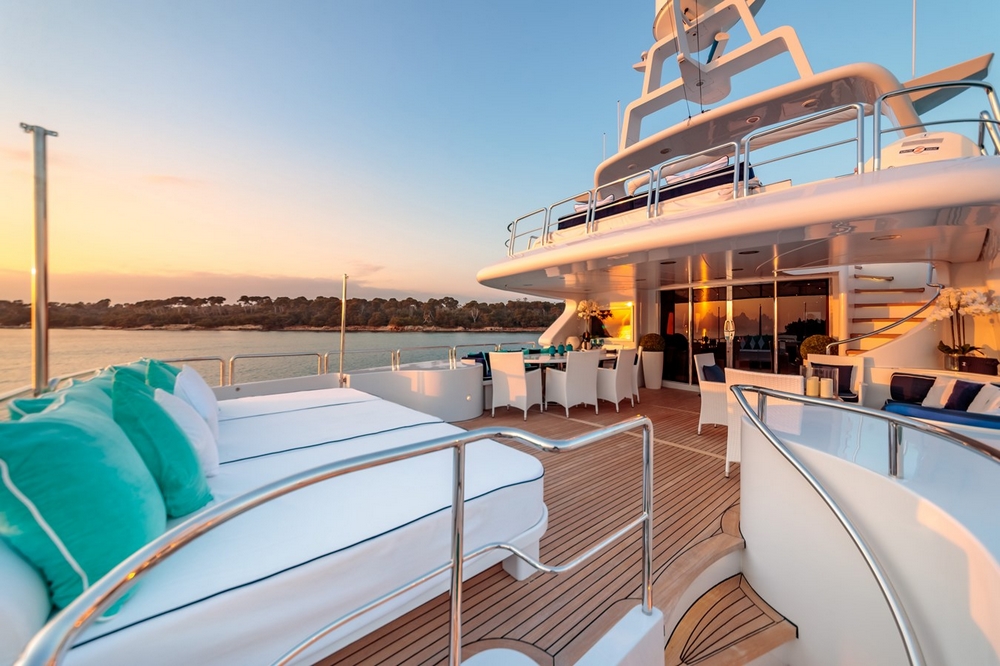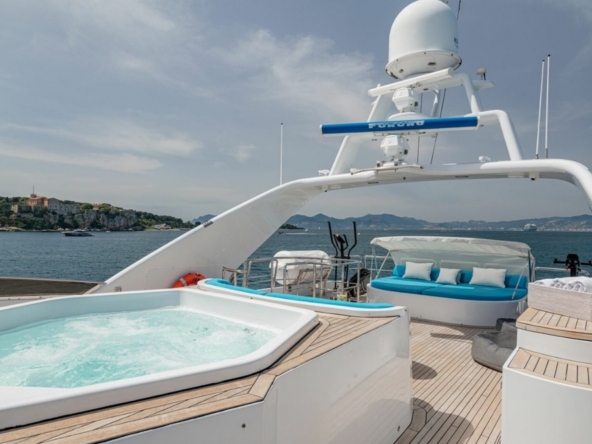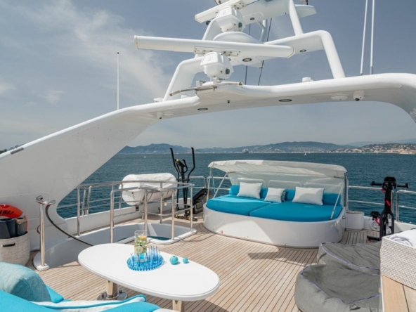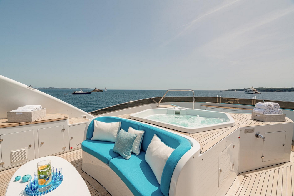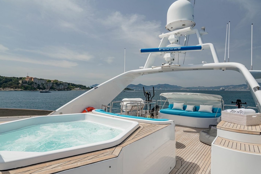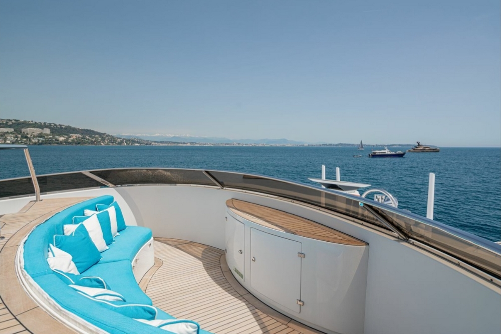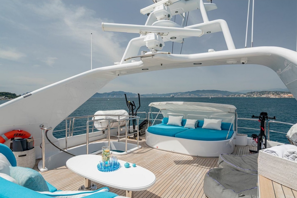 Un bain de soleil, pouvant être ombragé par un bimini repliable est à l’arrière du pont de soleil et deux machines de gymnastique sont de part et d’autre. Un petit salon, avec un canapé courbe devant une table basse ovale, et un jacuzzi surélevé offrant une vue panoramique, se situent au milieu, avec un meuble bar à bâbord. Tout à l’avant, une banquette en arc de cercle fait face à la mer. Si le soleil est trop intense, un bimini amovible peut être installé depuis l’arche porte antenne.