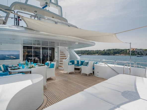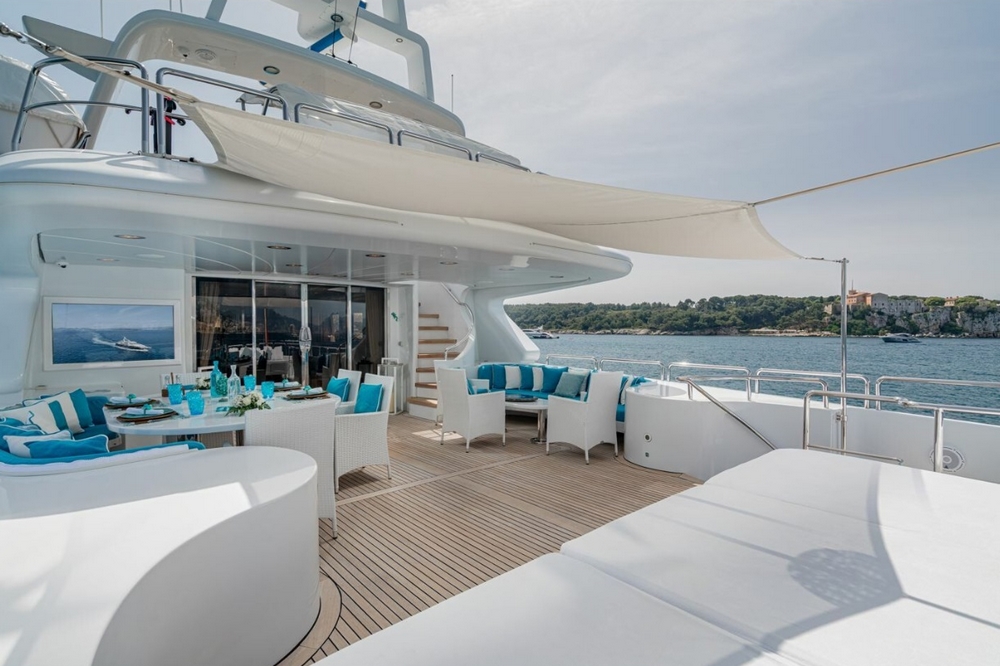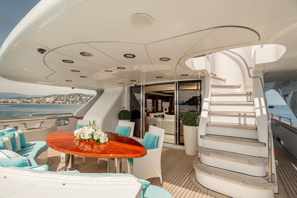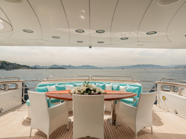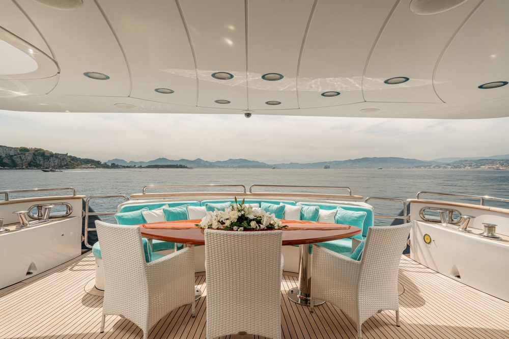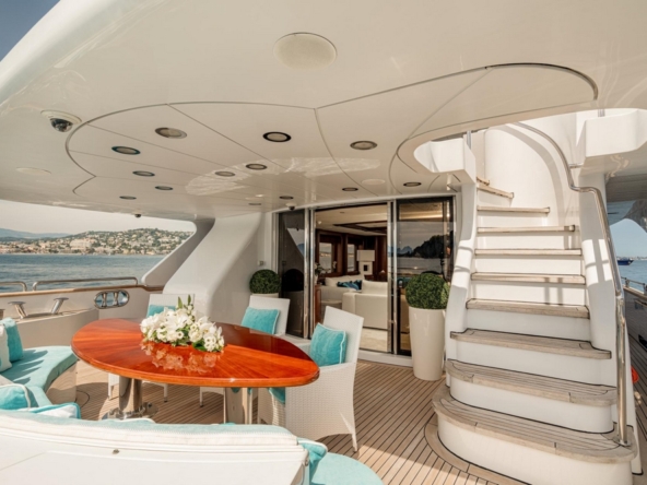 A l’extérieur, la terrasse est aménagée avec une salle à manger à bâbord pouvant accueillir dix convives, avec une table ovale, une banquette en U, et quatre fauteuils, un salon avec canapé, fauteuils, et table basse à tribord, et un bain de soleil pleine largeur à l’arrière. Cet espace peut être ombragé par un auvent rétractable.