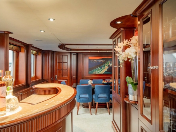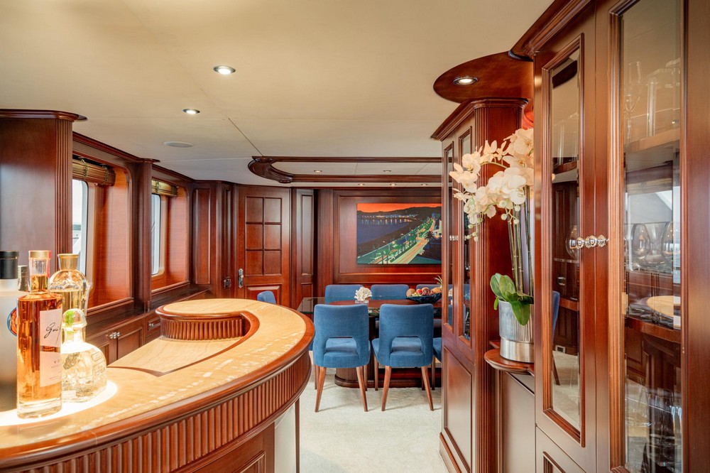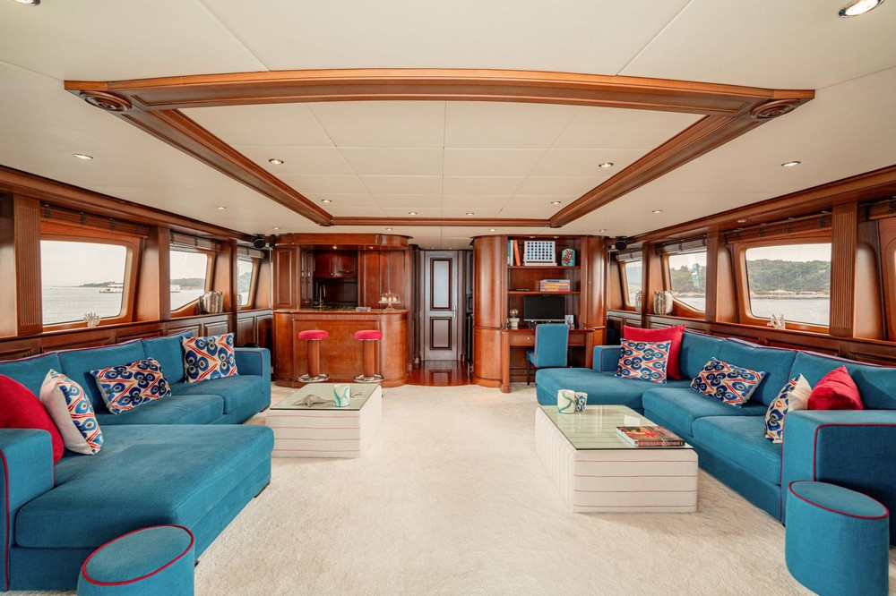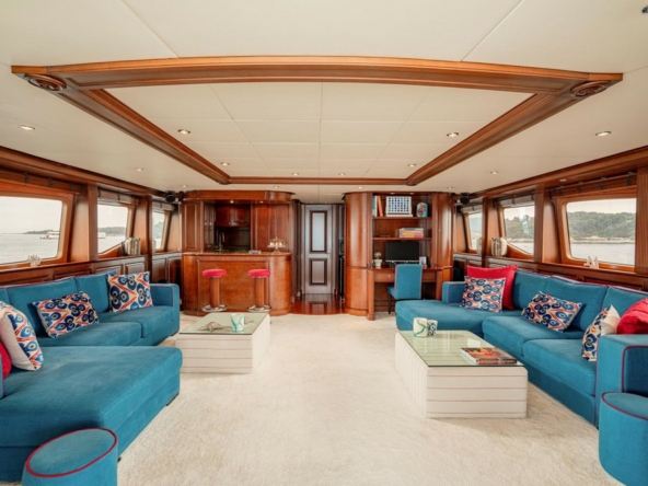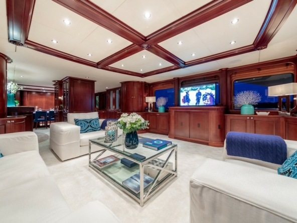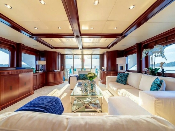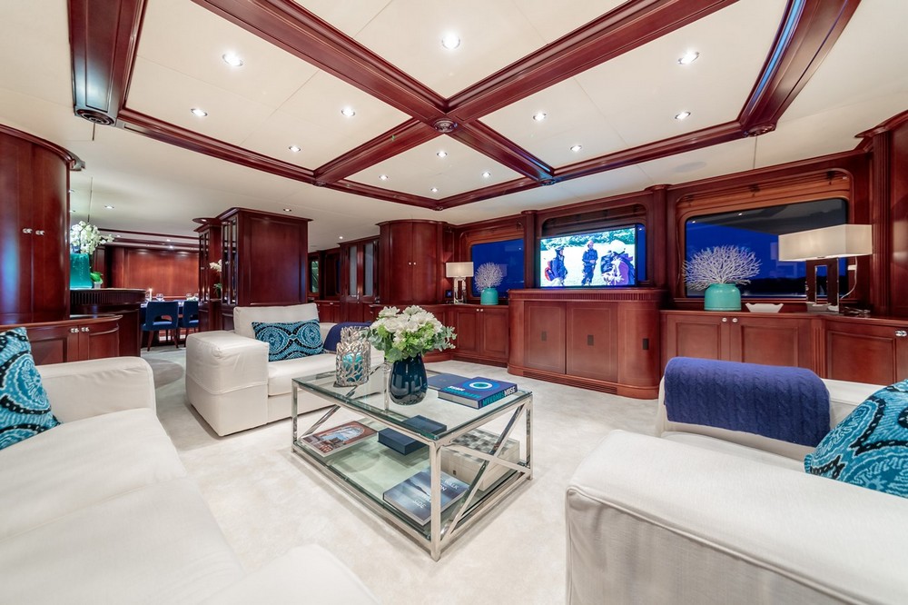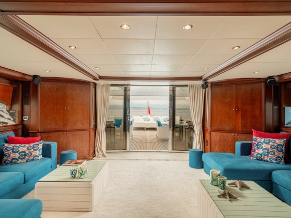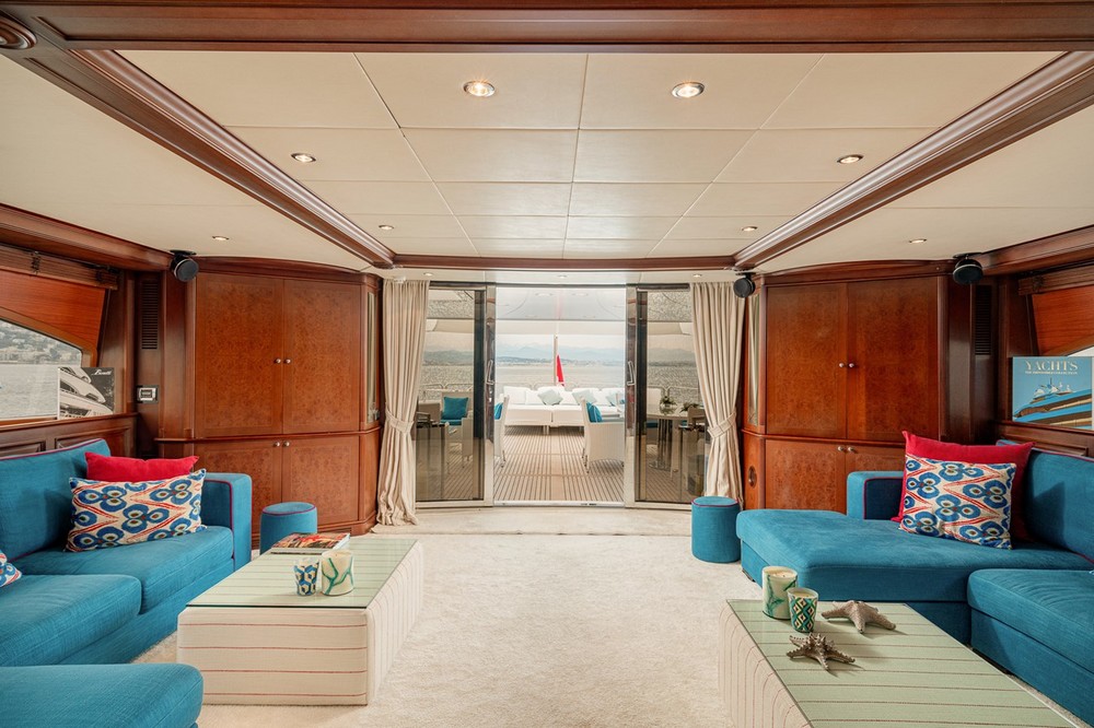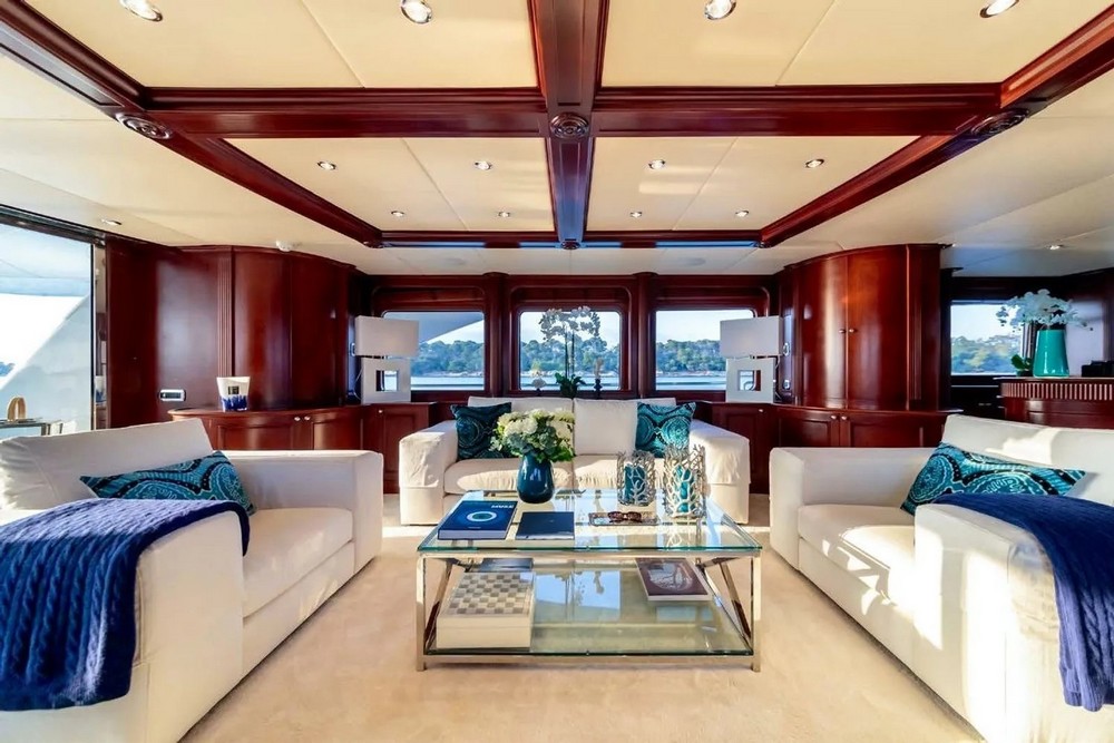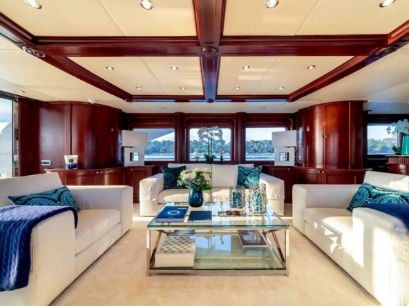 En entrant à l’intérieur du pont principal par la baie vitrée coulissante, on est frappé par l’espace et le luxe des aménagements, conçus par Francois Zuretti. Les boiseries et les marqueteries en merisier vernies, les plafonds, moquettes, et canapés blancs, créent une ambiance cossue et chaleureuse.