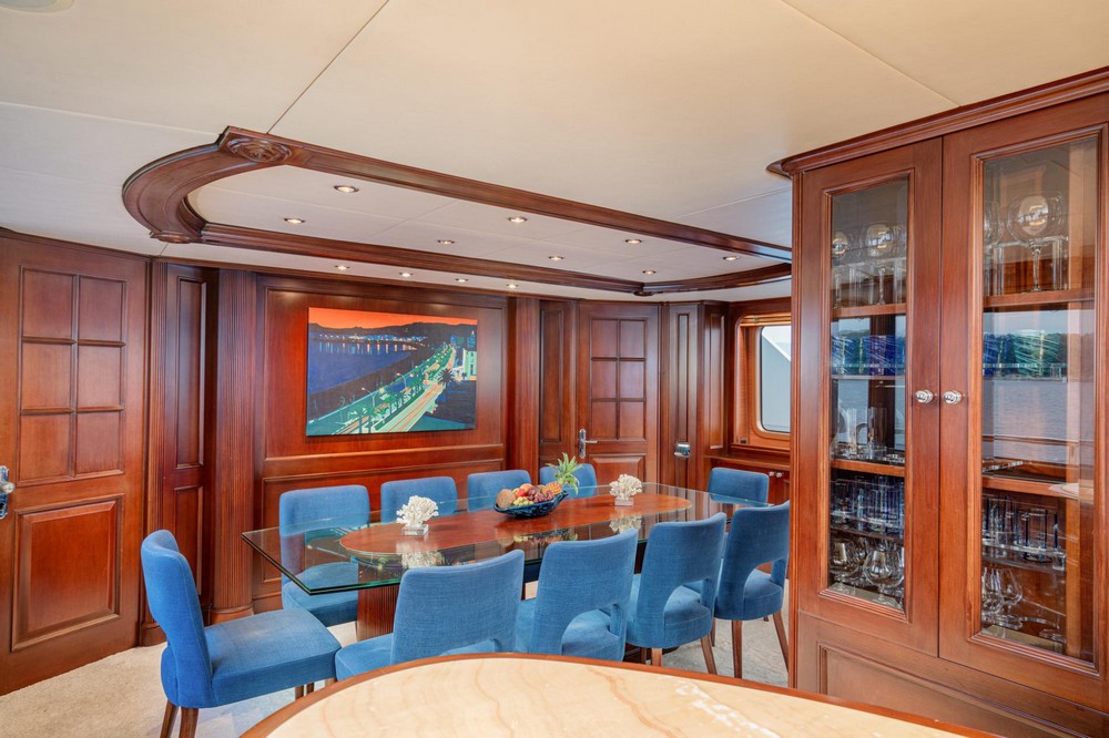 Sur le pont principal, abrité sous le surplomb du pont supérieur, le cockpit est aménagé en salle à manger, avec une grande banquette semi-circulaire et quatre fauteuils entourant une belle table ovale en acajou verni.