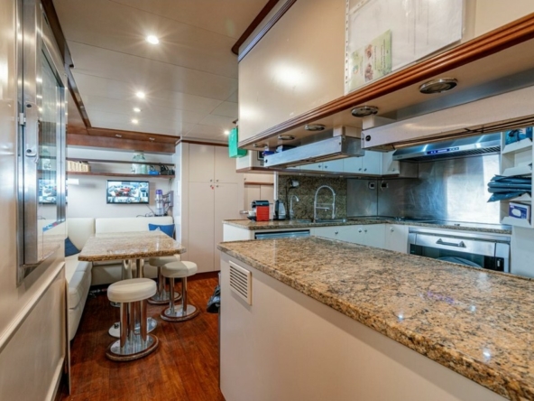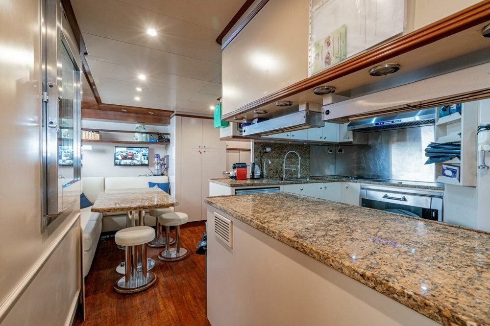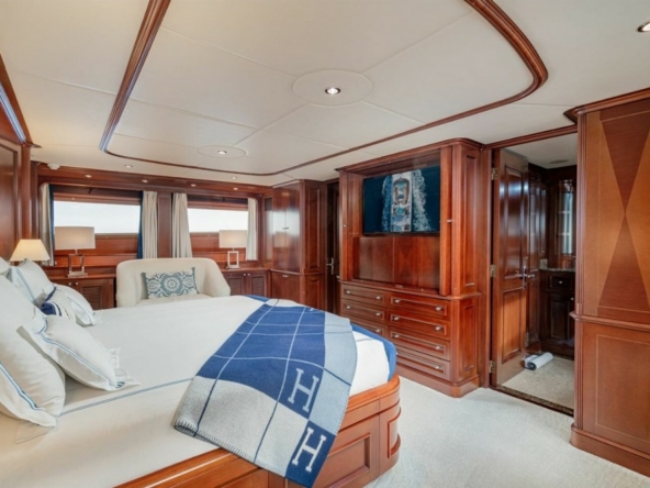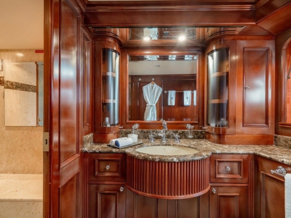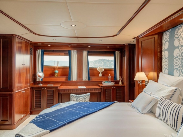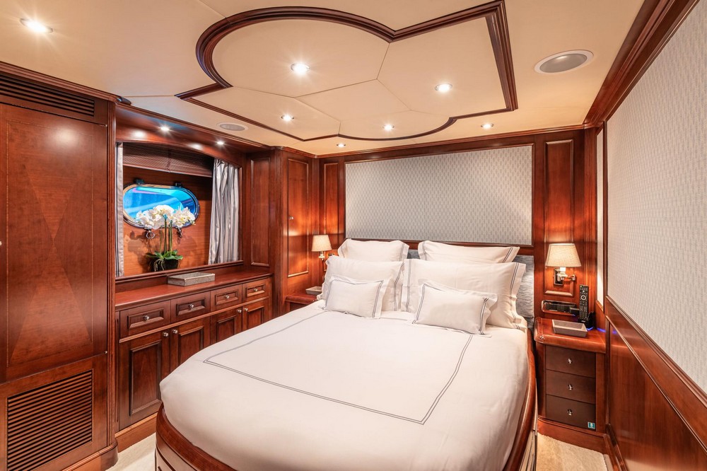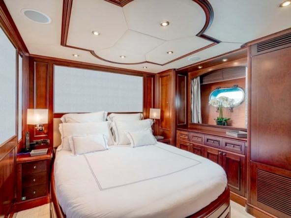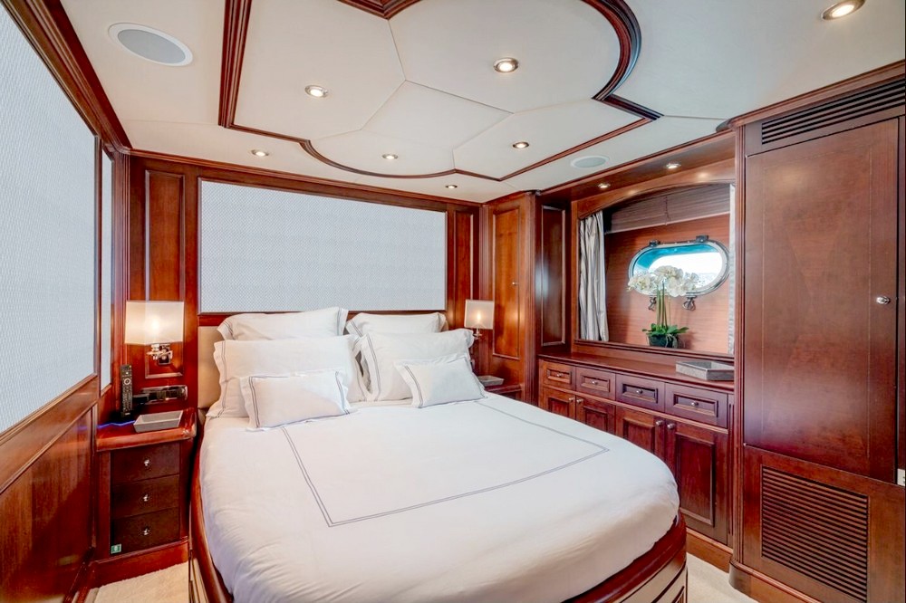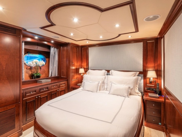 En avant, la grande cuisine fermée, blanche avec plans de travail en marbre, est entièrement équipée. L’escalier permettant l’accès au pont supérieur et une cave à vins se trouvent dans la coursive menant à la suite du propriétaire. Celle-ci occupe toute la largeur et possède un bureau privé à l’entrée. Elle est aménagée avec un lit king-size face au téléviseur encastré, un canapé, une coiffeuse, une penderie, et deux salles de bains reliées par une douche centrale avec hammam.