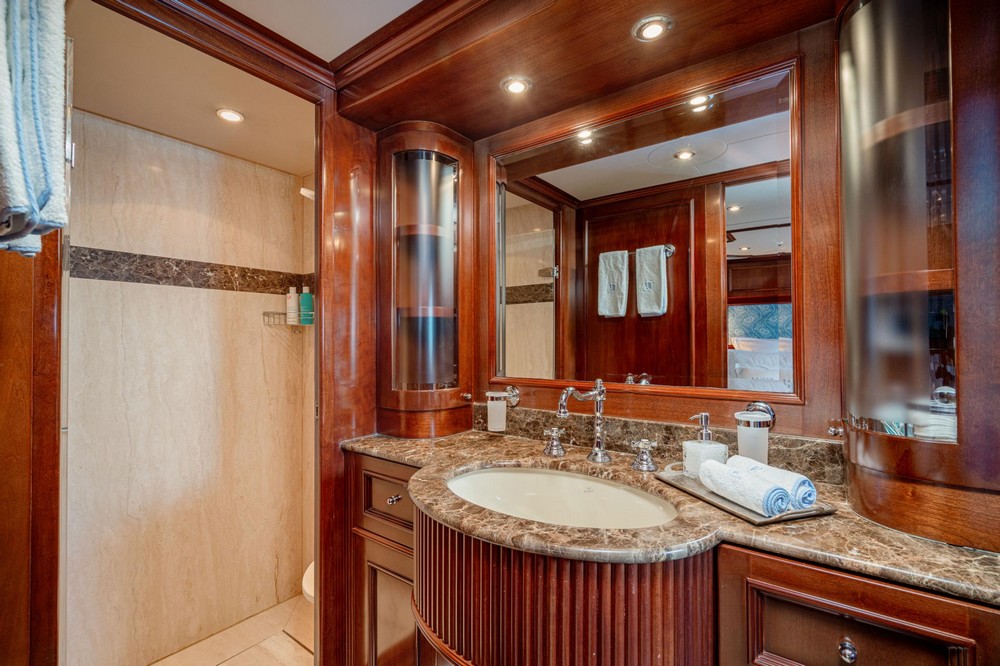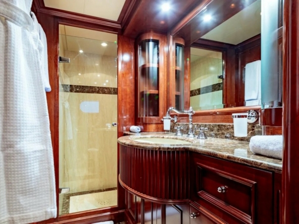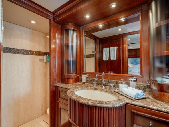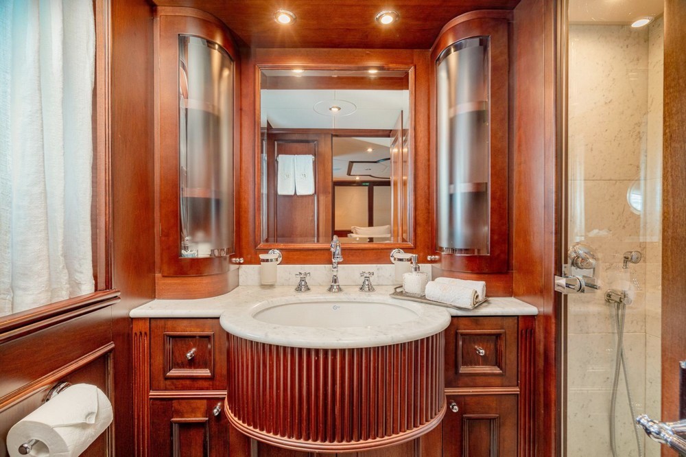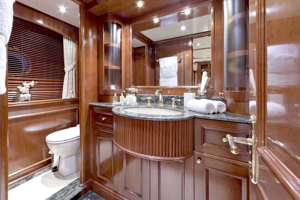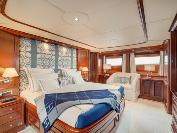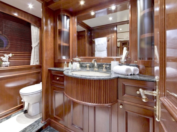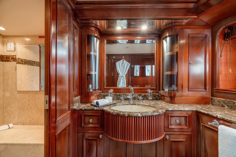 En avant, la grande cuisine fermée, blanche avec plans de travail en marbre, est entièrement équipée. L’escalier permettant l’accès au pont supérieur et une cave à vins se trouvent dans la coursive menant à la suite du propriétaire. Celle-ci occupe toute la largeur et possède un bureau privé à l’entrée. Elle est aménagée avec un lit king-size face au téléviseur encastré, un canapé, une coiffeuse, une penderie, et deux salles de bains reliées par une douche centrale avec hammam.
