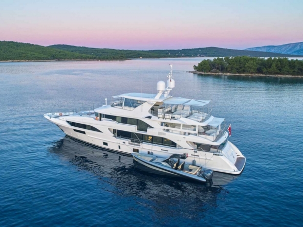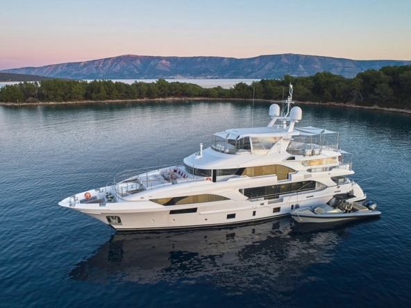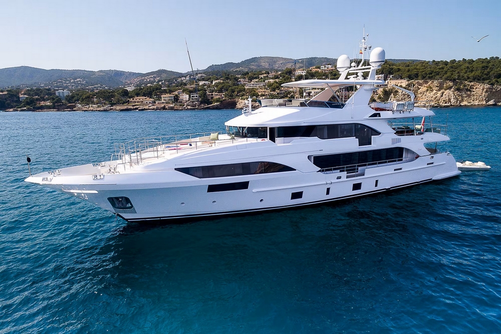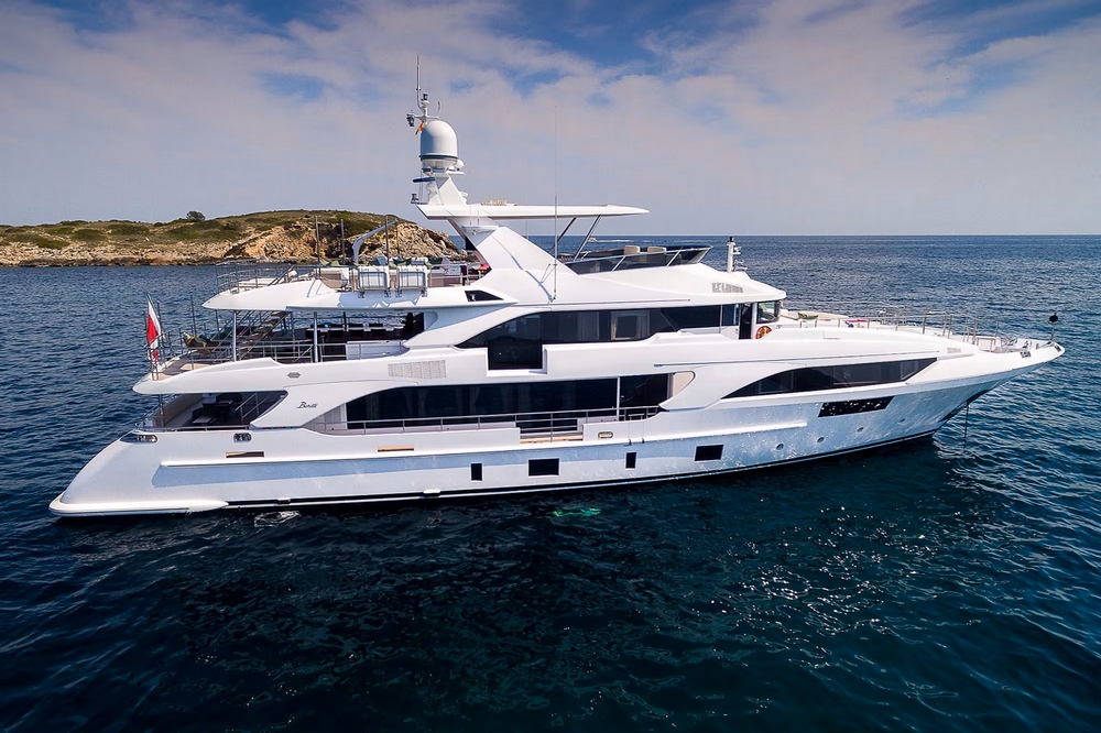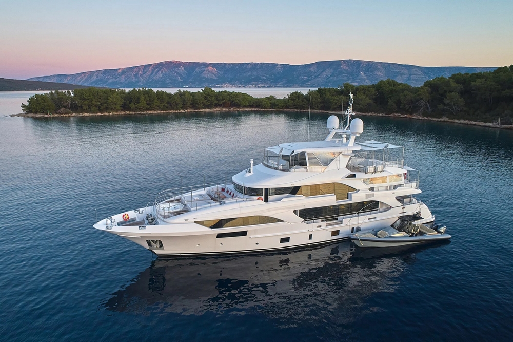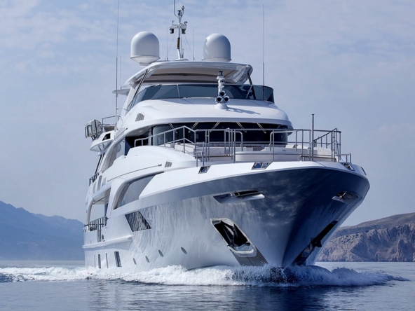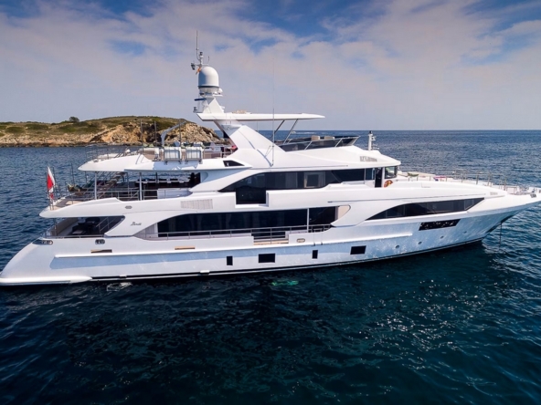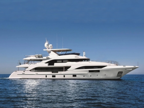 Ce yacht à trois ponts a des lignes extérieures élégantes et intemporelles signées par le célèbre designer Stefano Righini. Les hublots verticaux de la timonerie lui donnent un look de ‘navire hauturier’ qui augure la capacité transocéanique de ce bateau. Son volume habitable est impressionnant pour un bateau de 40 mètres. Construit en polyester par le talentueux chantier naval Benetti Yachts, il est robuste, marin, très confortable, et de grande qualité.