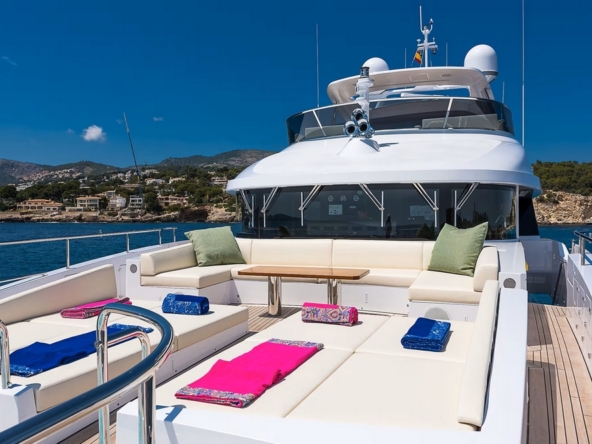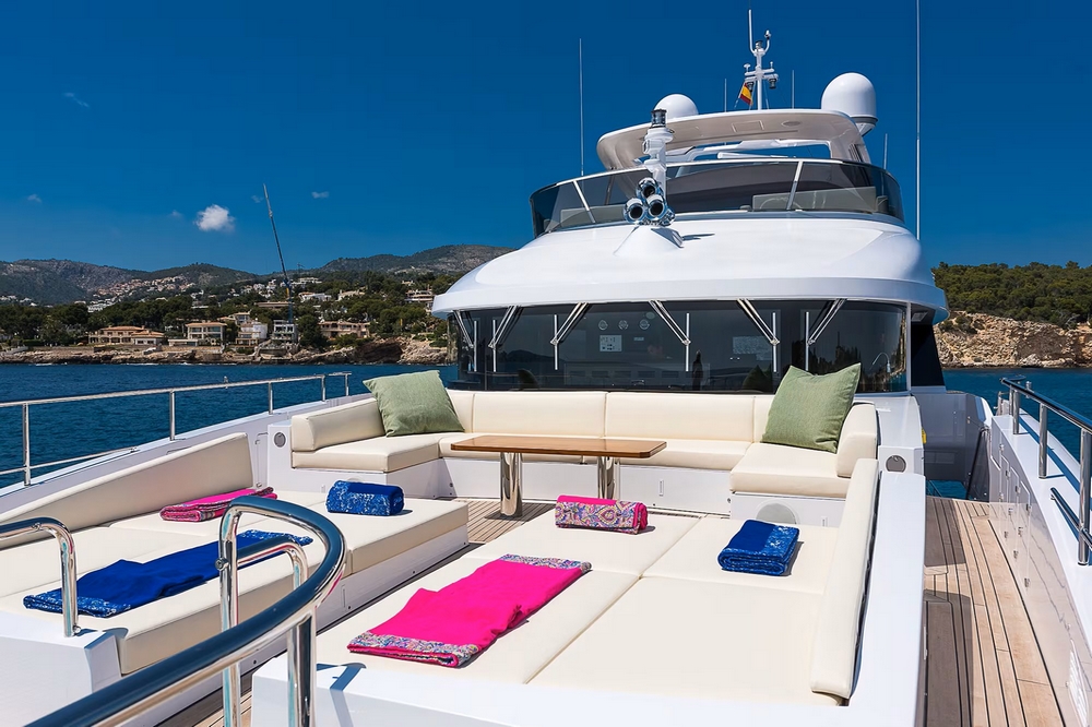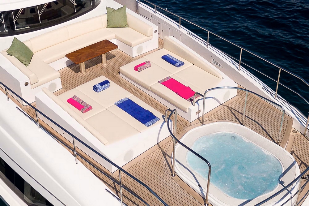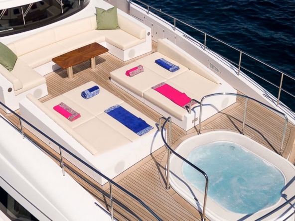 Un deuxième jacuzzi est situé sur le pont avant, ainsi que deux grands bains de soleil, et un salon portugais avec table basse rectangulaire entourée par un canapé en U.