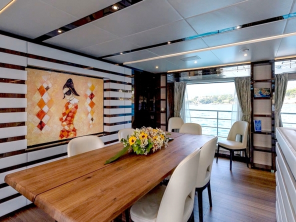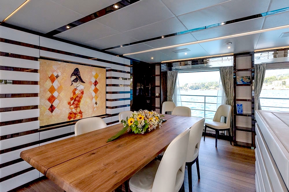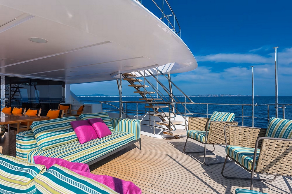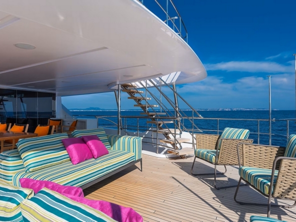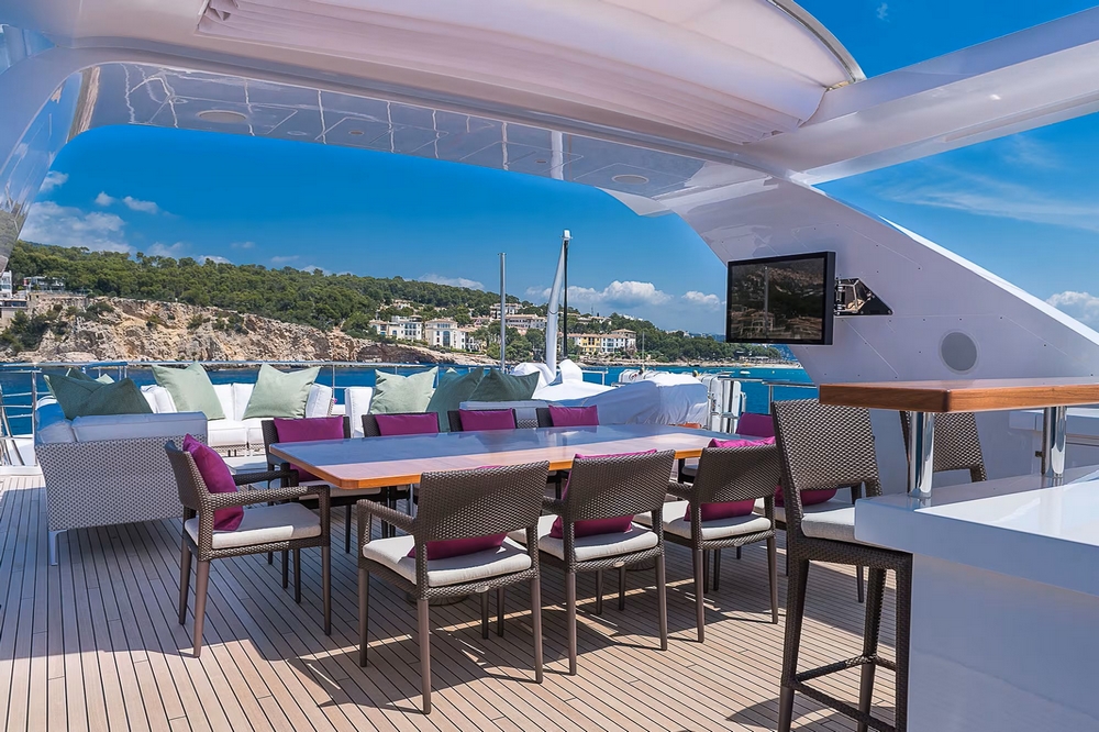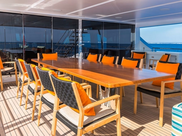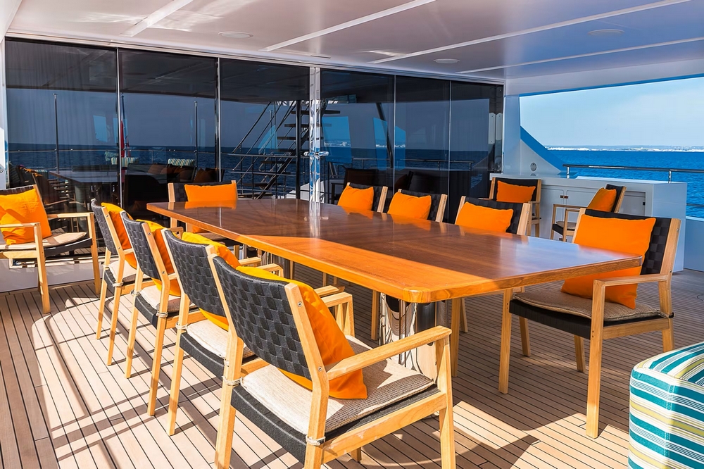La terrasse extérieure est conviviale et aménagée d’une autre salle à manger avec table rectangulaire en teck entourée par dix à douze fauteuils, et d’un grand salon avec deux canapés installés en L, de trois fauteuils, et d’une table basse. La musique est toujours diffusée via un amplificateur Denon et des enceintes Promar, et la télévision est une QLS étanche de 52 pouces.