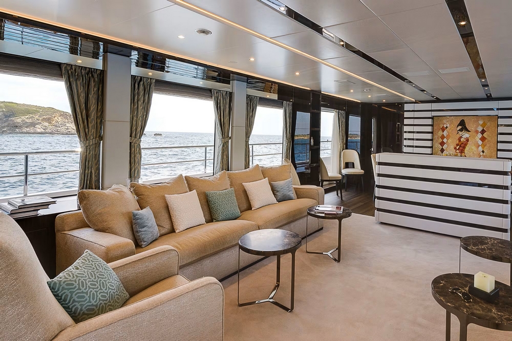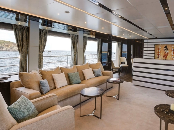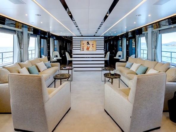 . Le tiers-arrière est aménagé avec le salon occupant toute la largeur, avec deux canapés, deux fauteuils, et