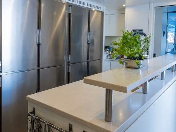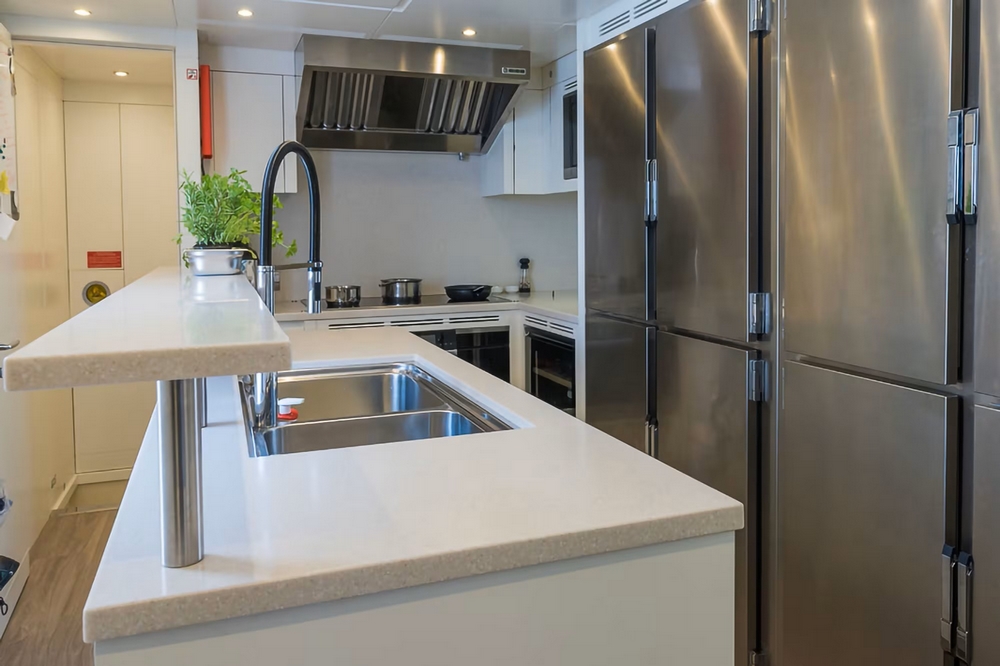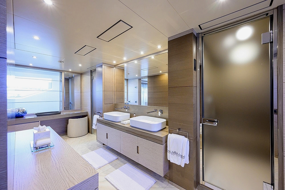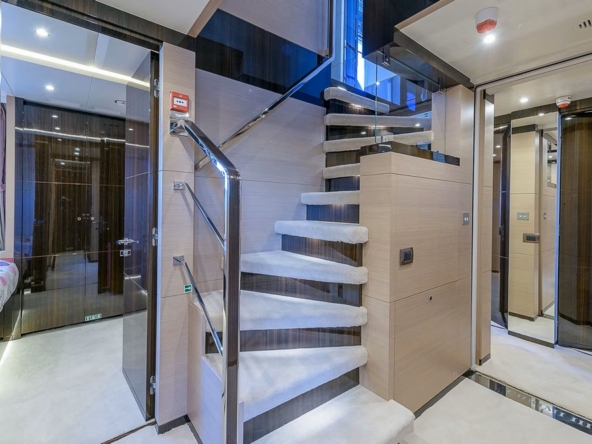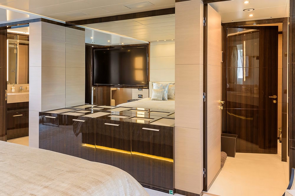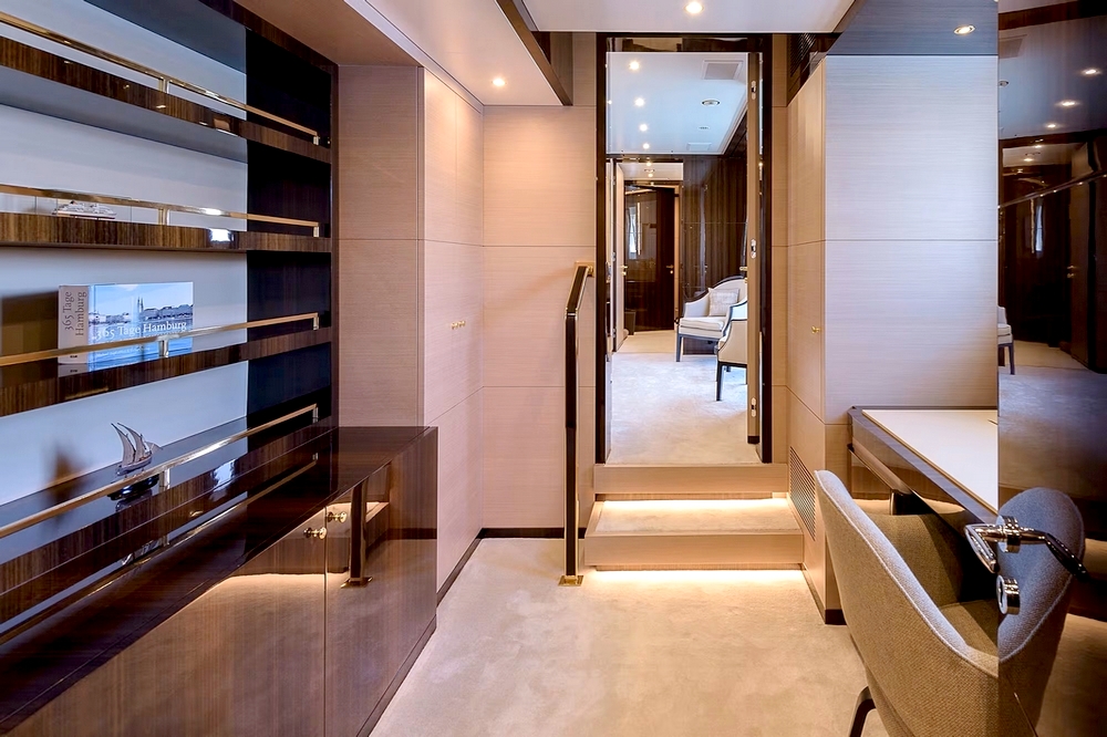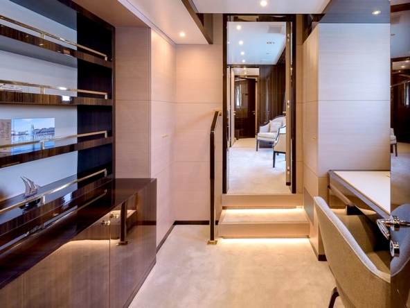 Vers l’arrière, une coursive permet d’accéder à une toilette de jour, à la buanderie avec deux lave-linges et un sèche-linge Miele, et à la salle de sport avec téléviseur Samsung de 26 pouces, à tribord, ainsi qu’à la cabine du capitaine avec téléviseur Samsung de 22 pouces et salle de bain attenante, à bâbord.