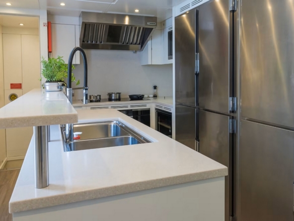 . Le tiers-milieu comprend la cuisine en U à bâbord. Elle est moderne, toute blanche, et entièrement équipée