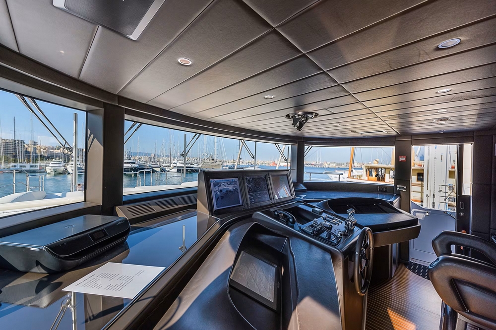 Accessible par des escaliers sur chaque passavant du pont principal et deux portes étanches, la timonerie est digne d’un super yacht. Derrière les trois grands hublots du pare-brise vertical, la console à instruments inspire le respect. La visibilité est excellente depuis la barre à roue et son confortable fauteuil de barre.