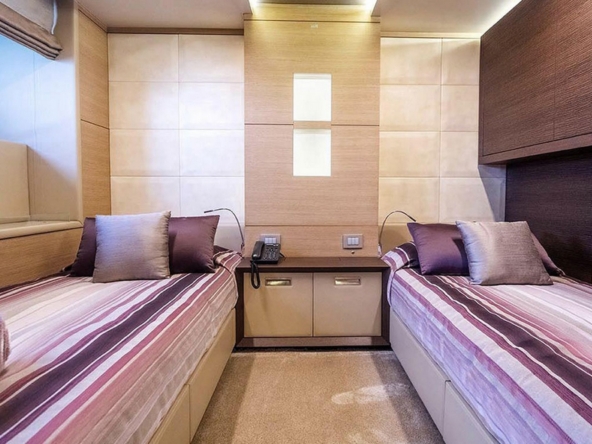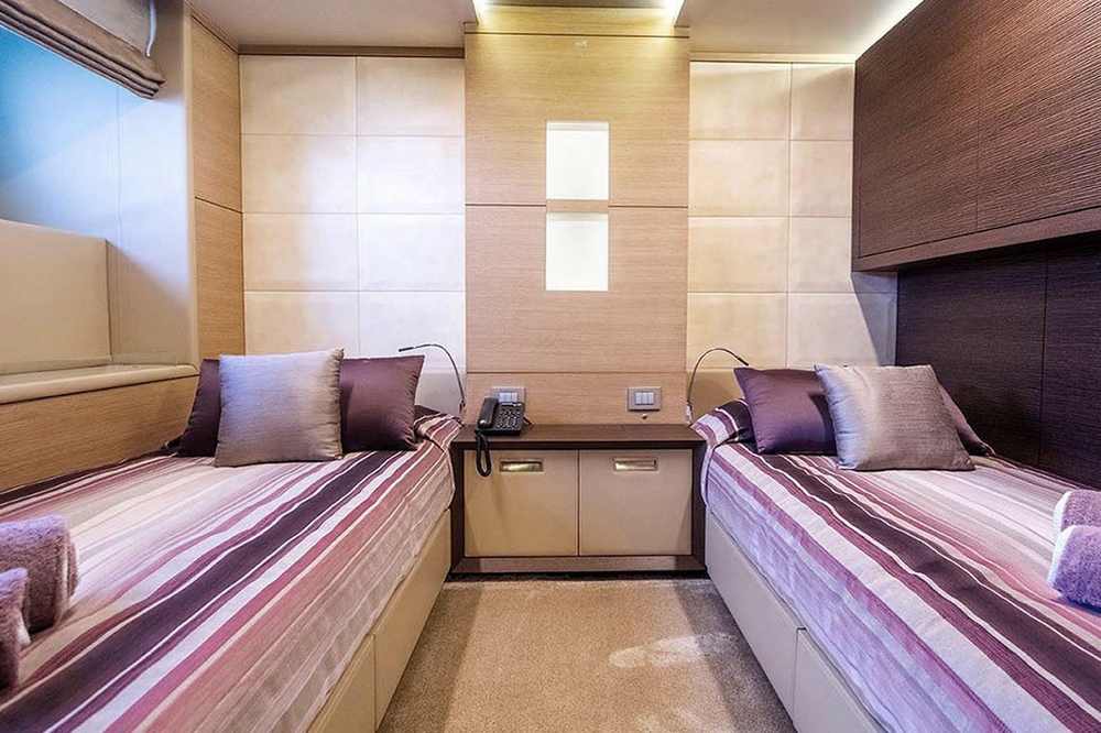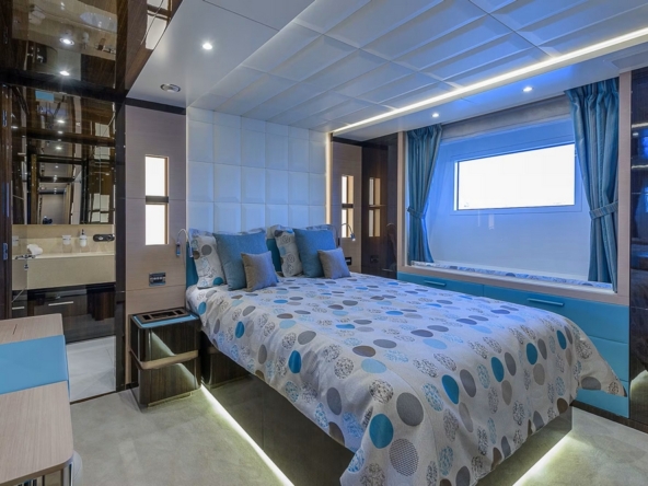 Il peut accueillir 12 personnes dans 5 cabines et 7 membres d’équipage dans 4 cabines.