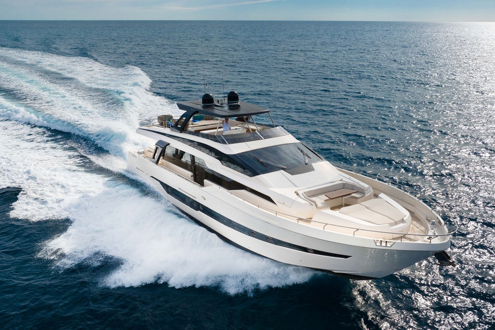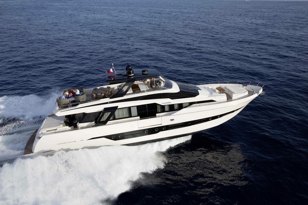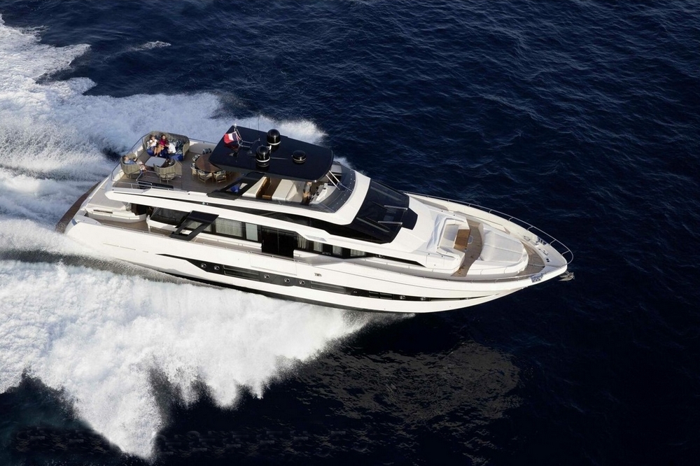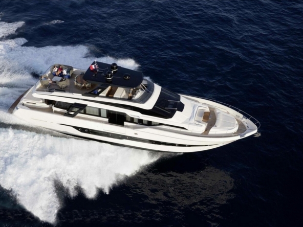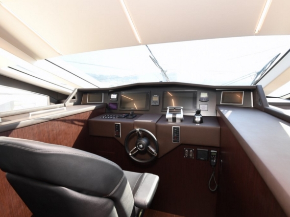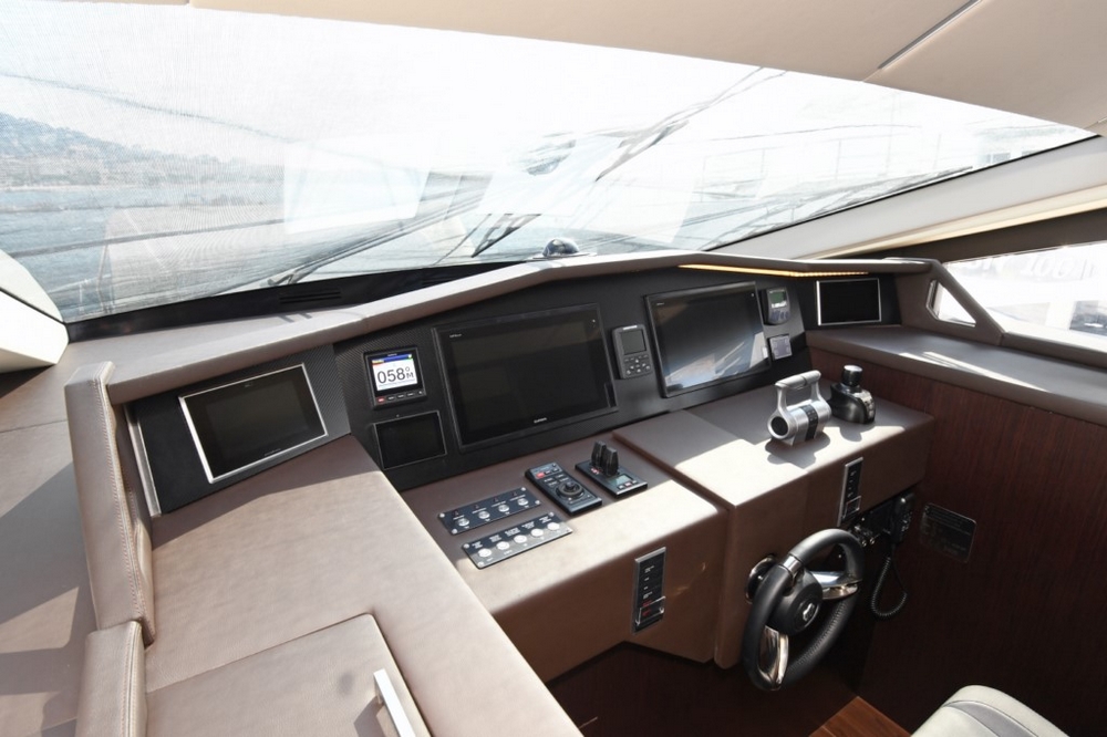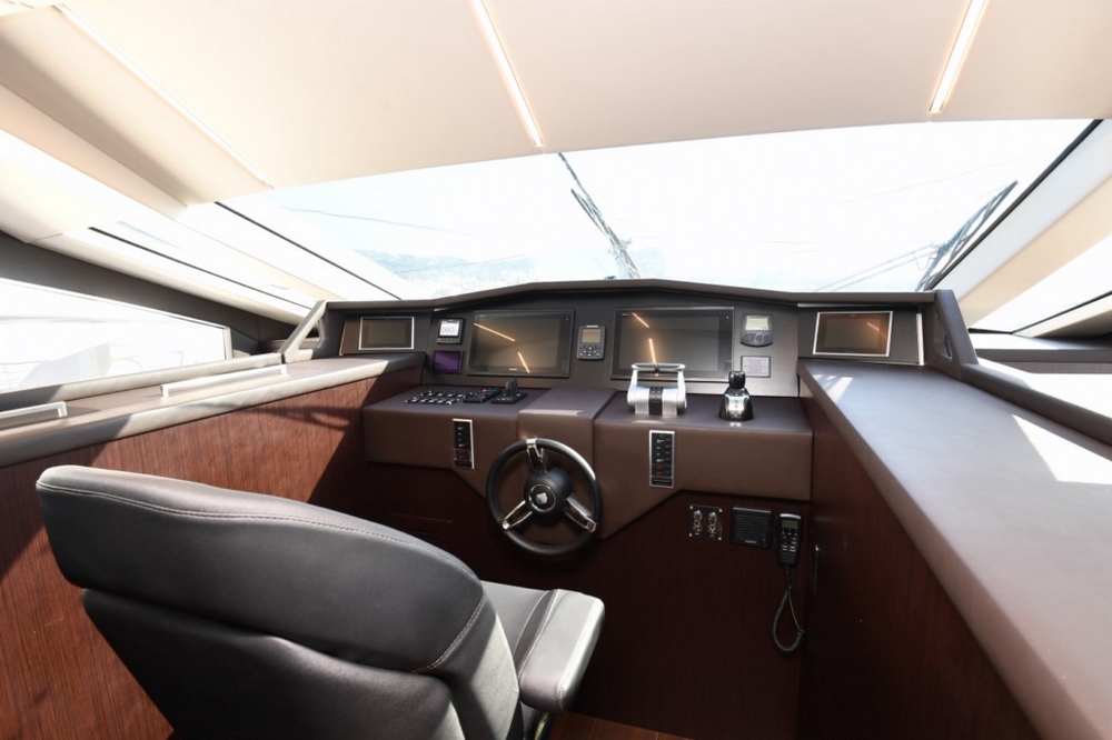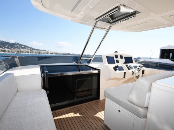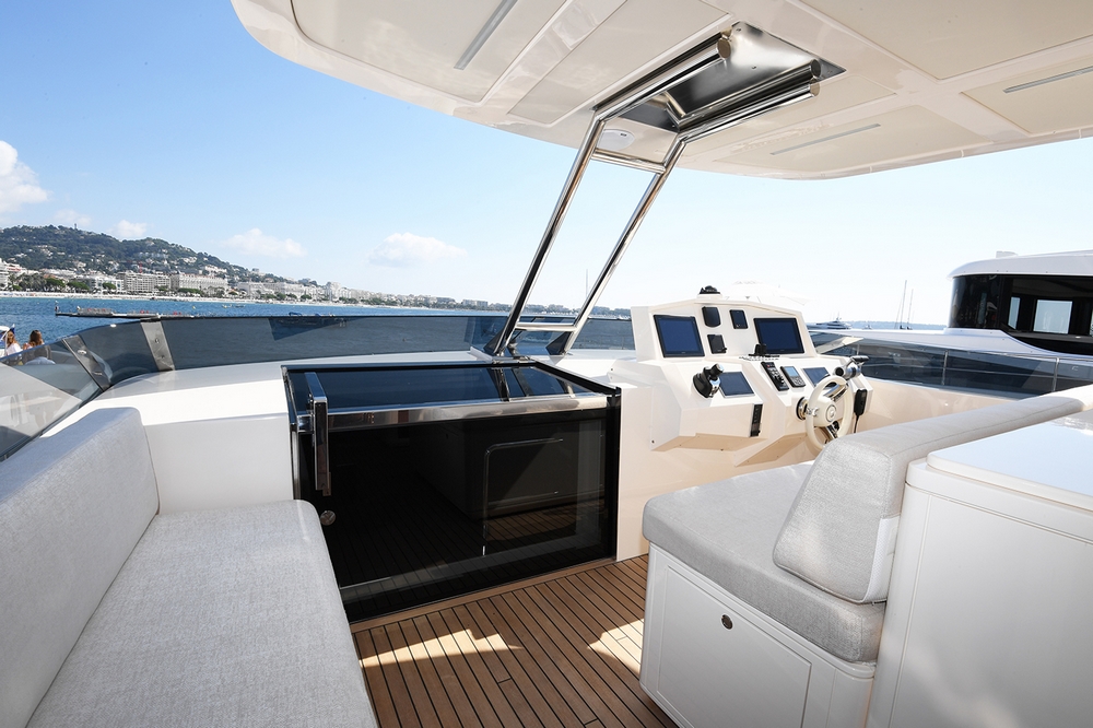 Son spacieux flybridge est abrité par un hard-top laqué noir. Un salon, avec table basse entourée par un canapé et deux fauteuils, est installé à l’arrière. Une salle à manger, pouvant accueillir huit personnes, occupe le centre, avant un bar avec trois tabourets. Le poste de pilotage est à l’avant-tribord, avec console à instruments, volant sport, et banc de barre triplace, alors qu’une banquette est à bâbord.