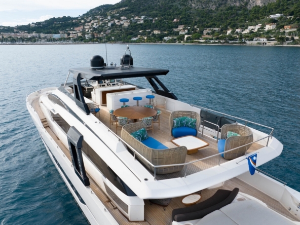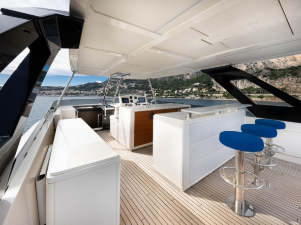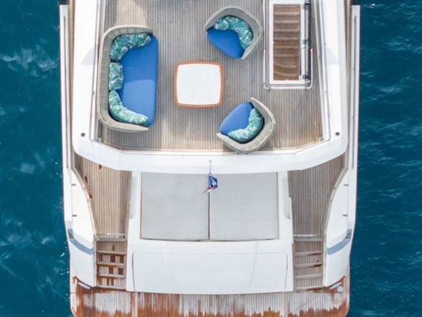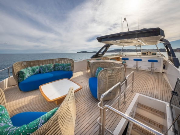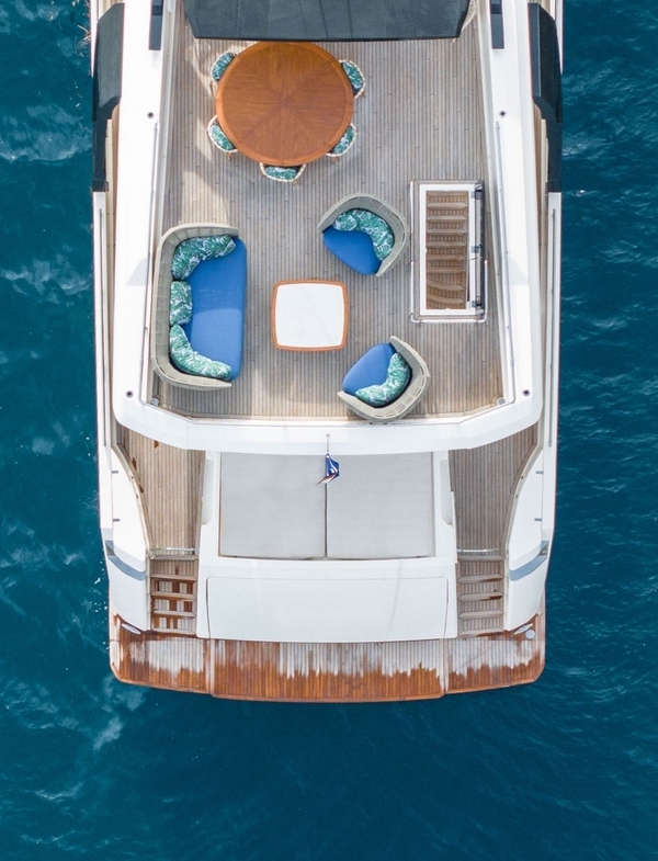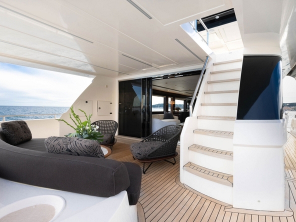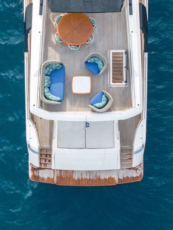 Un deuxième bain de soleil est sur le pont arrière. Un salon extérieur occupe le cockpit, avec un canapé semi-circulaire et deux fauteuils entourant une table basse. Deux escaliers de part et d’autre du tableau arrière permettent un accès à la plateforme de bain submersible et au vaste garage permettant le stockage de l’annexe et du jet ski.