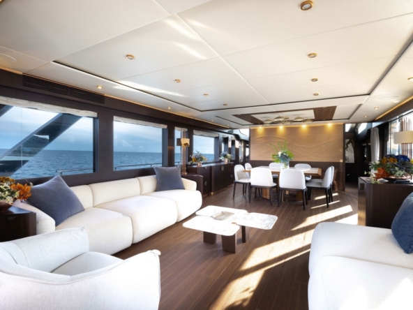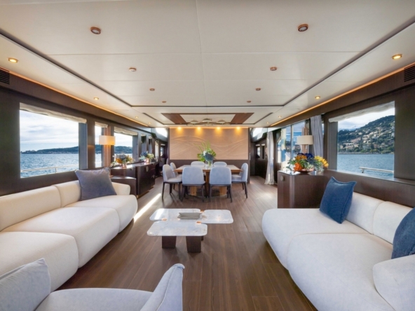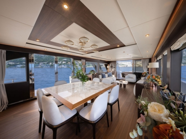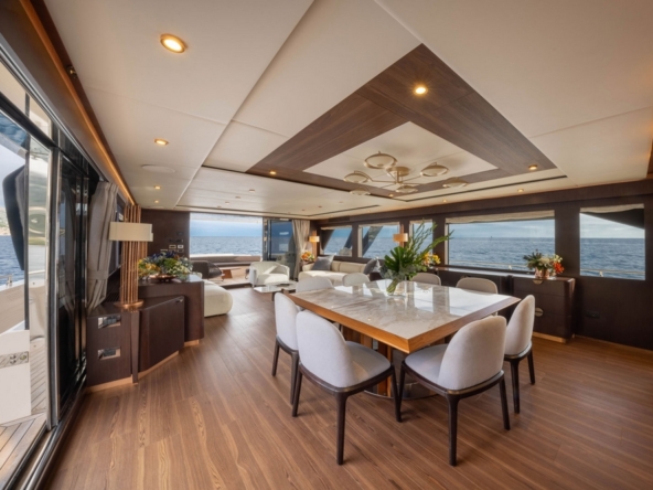 Le vaste salon occupe toute la largeur à l’entrée. Il est constitué par une table basse, deux canapés et un fauteuil. En avant, la belle table de la salle à manger est entourée par huit chaise. Une baie vitrée coulissante électrique à tribord donne accès au passant et à un balcon rabattable.
