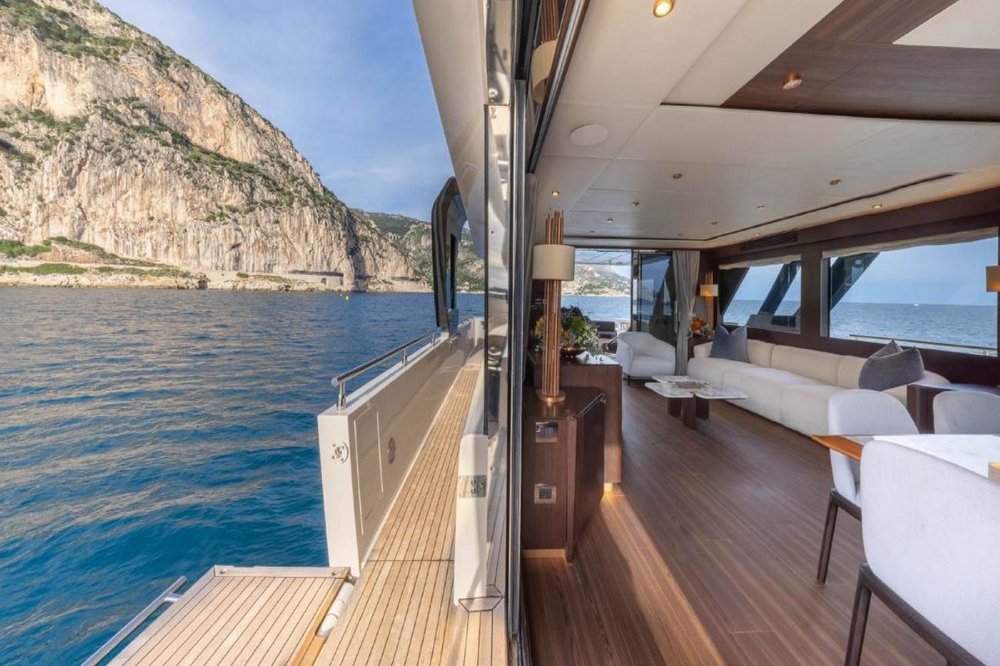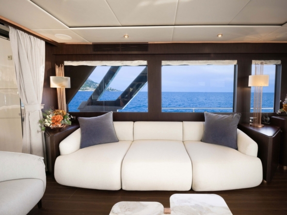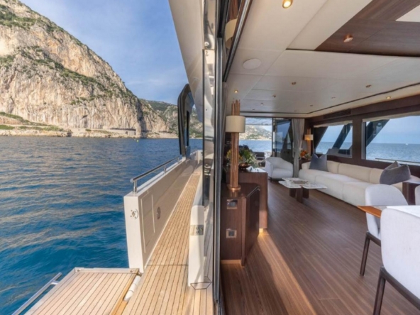 L’entrée à l’intérieur du pont principal se fait par une baie vitrée coulissante électrique. Le design raffiné offre une ambiance luxueuse et accueillante. Les selleries en cuir blanc contrastent avec les planchers en teck et les vaigrages en wengé, mis en valeur par la lumière naturelle diffusée à travers les grandes fenêtres latérales.