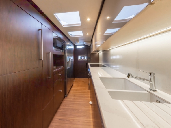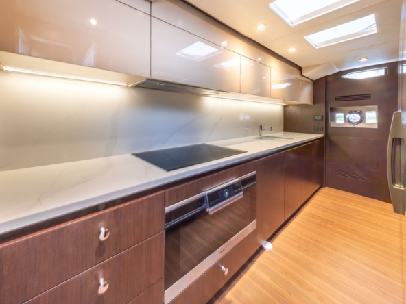 Tout à l’avant, la cuisine s’étant sur toute la largeur du bateau. Elle est équipée d’un plan de travail en Corian blanc avec un évier double bac, une plaque à induction avec hotte aspirante, un four électrique, un micro-ondes, un lave-vaisselle, un réfrigérateur et un congélateur.