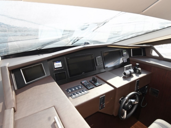 La timonerie surélevée a une belle console à instruments, un volant sport, et un confortable fauteuil de barre.
