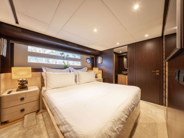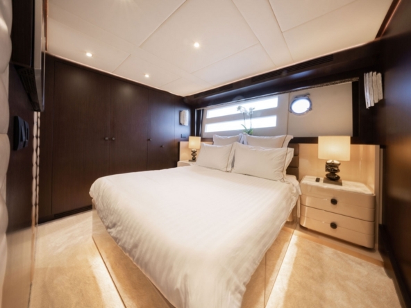 . La cabine VIP est à l’avant avec un lit queen-size au pied duquel se trouve un meuble intégrant le téléviseur