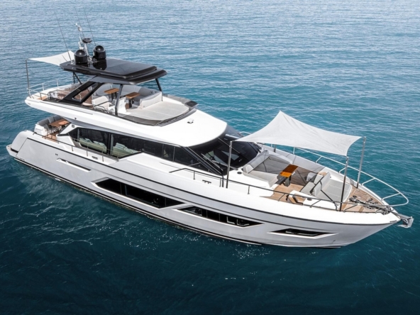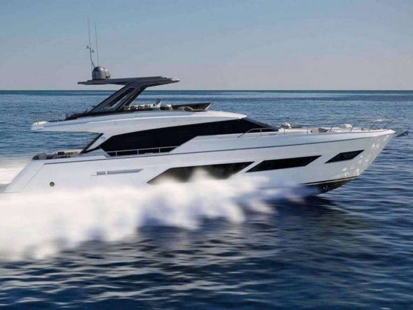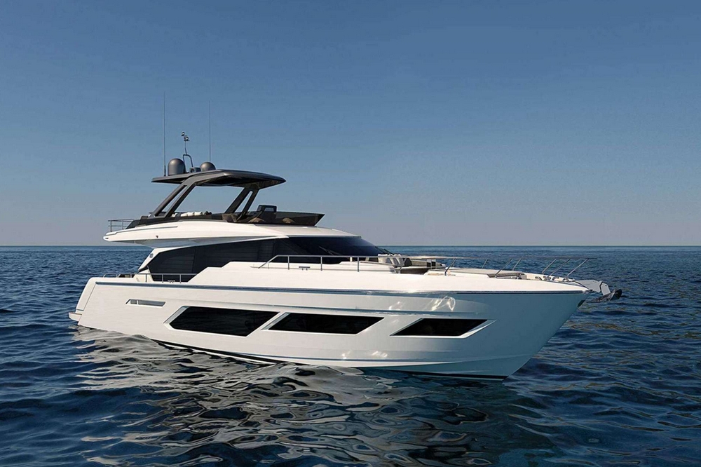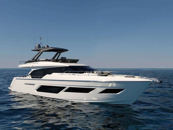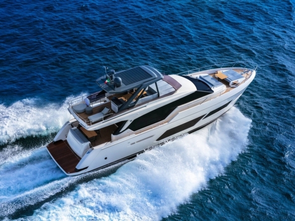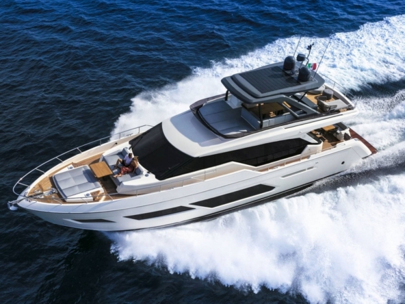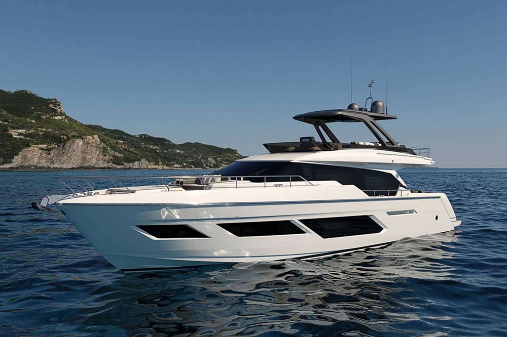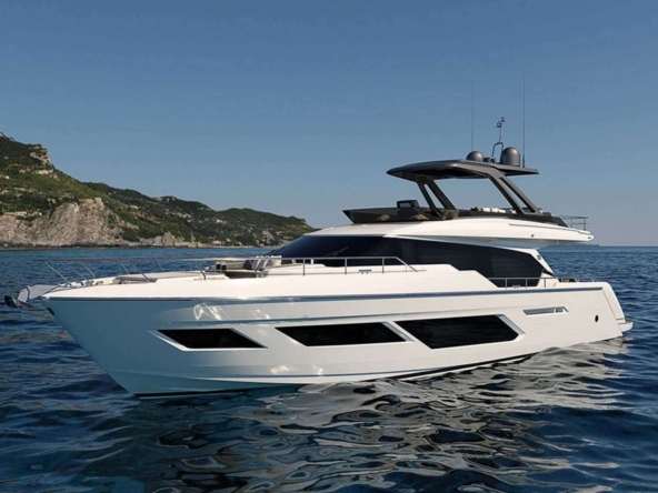 La ligne très pure de ce bateau dégage une grande classe. Ses proportions sont parfaites et les six grands hublots de coque allongés lui donnent une allure très moderne. Conçu et construit en polyester par Ferretti Group, ce yacht allie robustesse, confort, et performances.