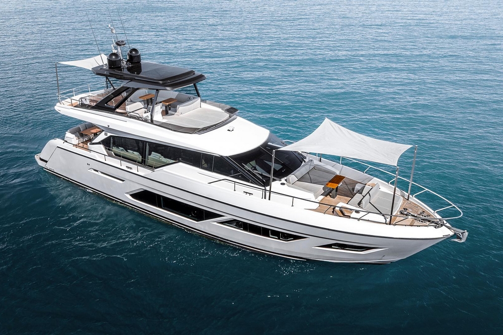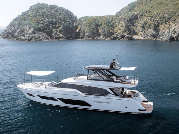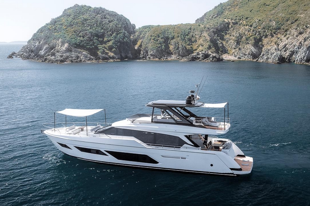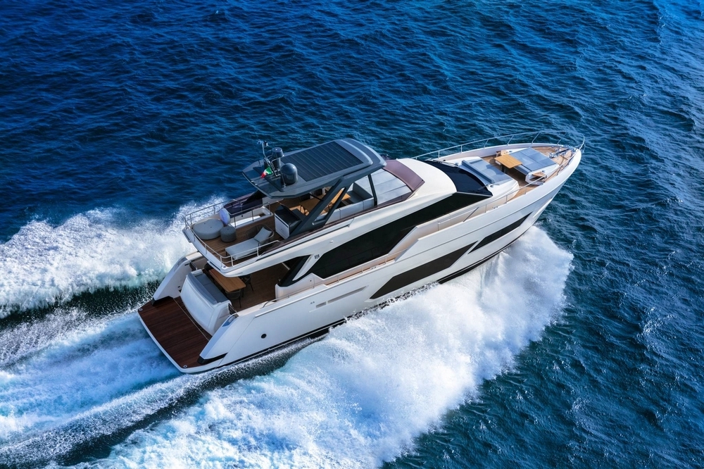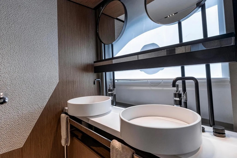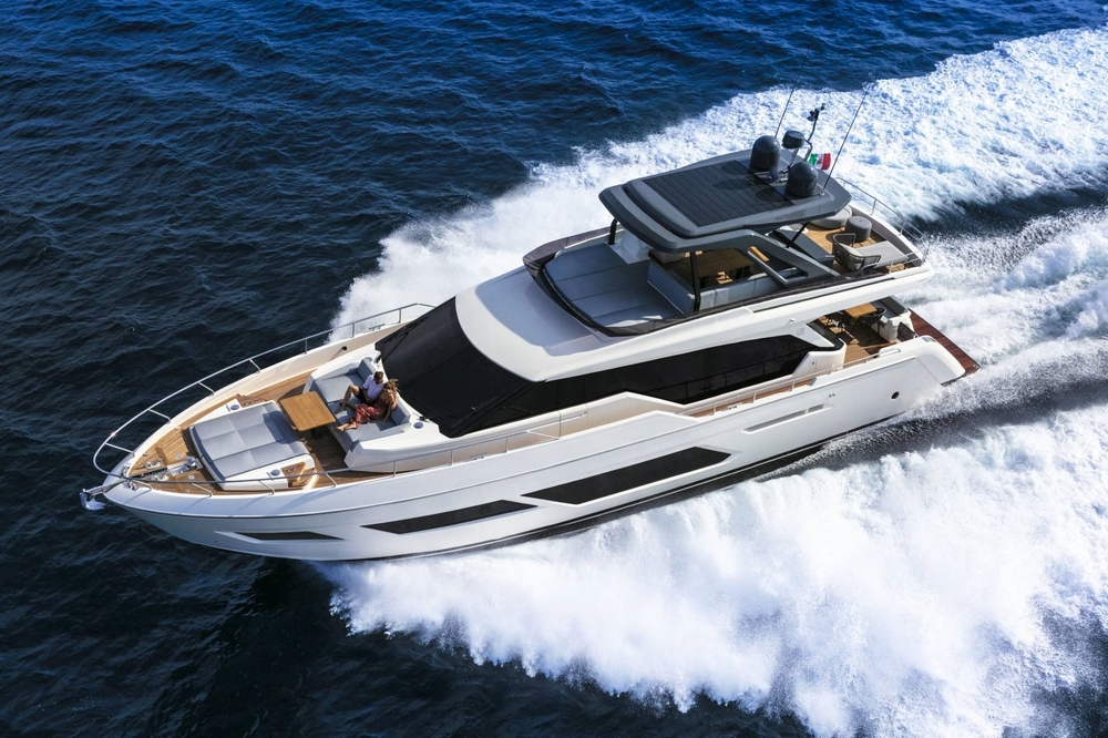 La ligne très pure de ce bateau dégage une grande classe. Ses proportions sont parfaites et les six grands hublots de coque allongés lui donnent une allure très moderne. Conçu et construit en polyester par Ferretti Group, ce yacht allie robustesse, confort, et performances.