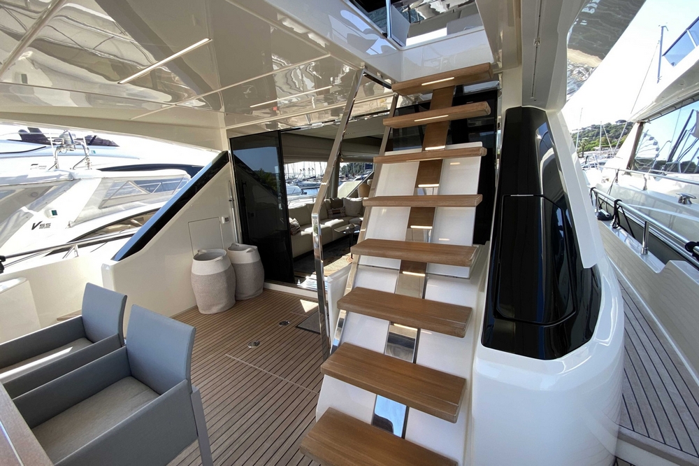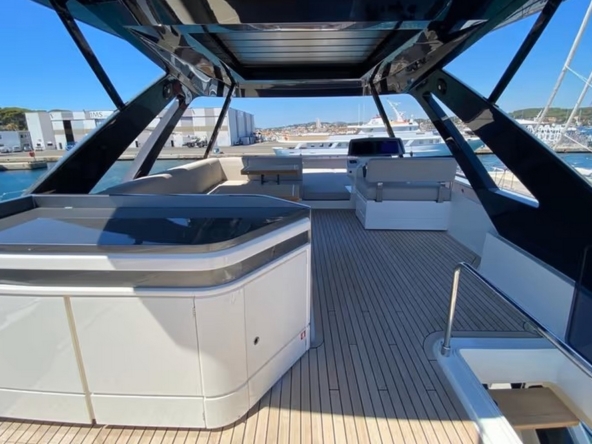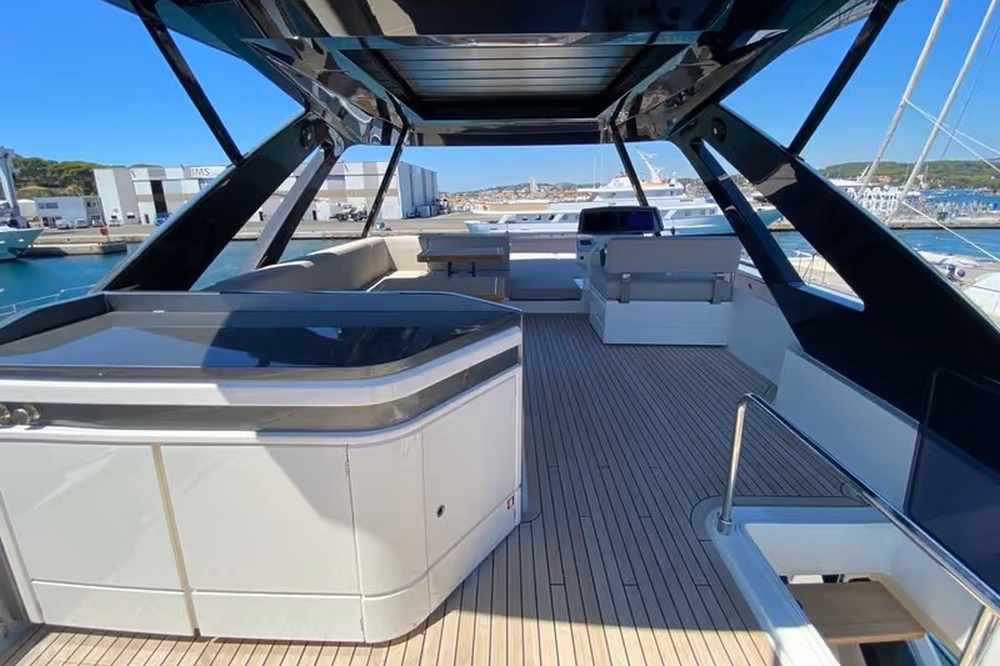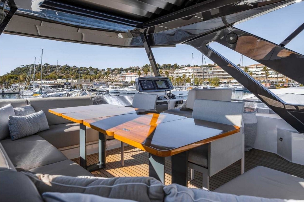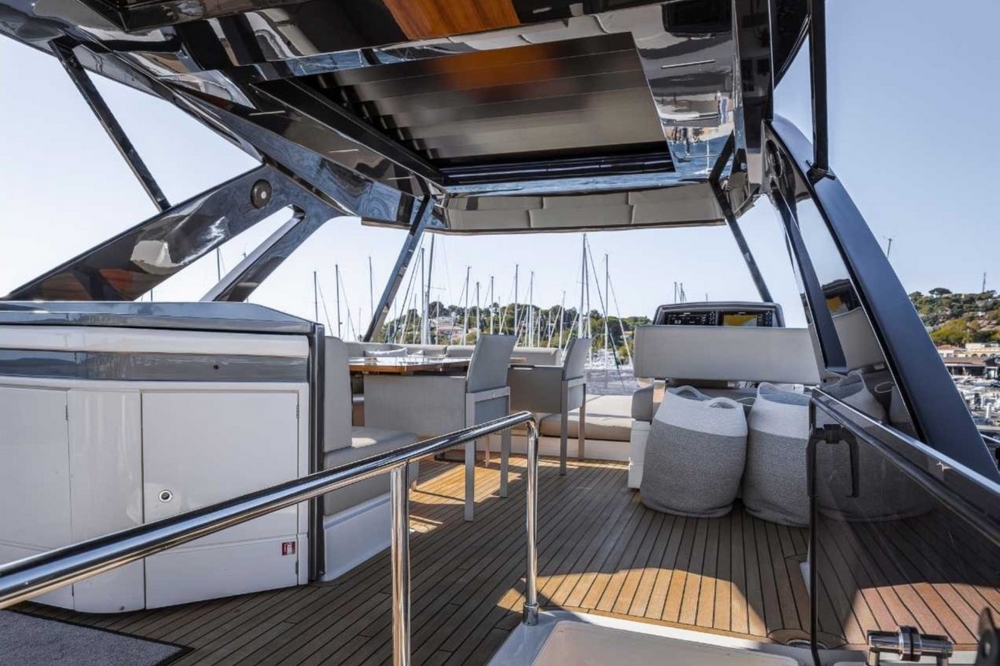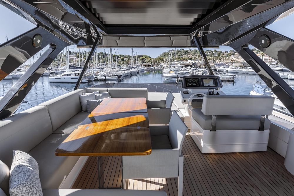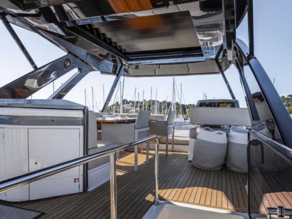 La plage arrière du flybridge peut accueillir bain de soleil, ou transats, ou fauteuils, et un auvent peut être fixé sur des poteaux en carbone. Ombragé sous l’élégant hard-top avec toit ouvrant intégré, se trouve le salon/salle à manger avec canapé en U et deux fauteuils entourant deux tables dépliables en teck. Le bar est équipé d’un évier, d’une plancha, et d’un réfrigérateur. Le poste de pilotage avec son banc de barre biplace est à l’avant-tribord et un bain de soleil est à bâbord.