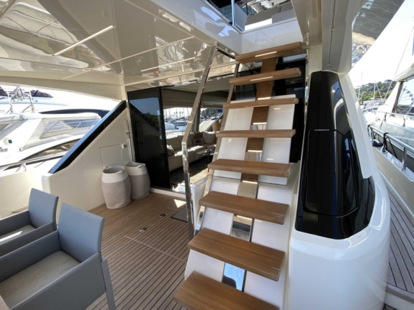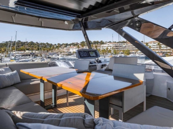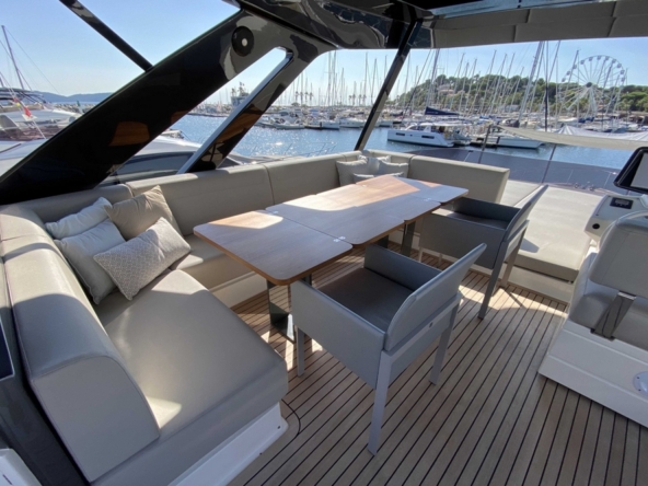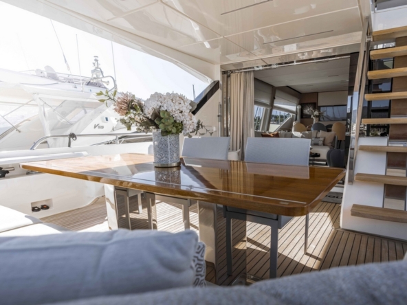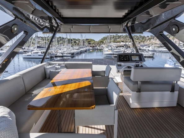Abrité sous le surplomb du flybridge, le cockpit est aménagé en salle à manger avec table rectangulaire en teck entourée par une banquette et quatre fauteuils. Deux escaliers donnent accès à la plateforme de bain et à l’astucieux siège rabattable du tableau arrière offrant un bain de soleil supplémentaire.