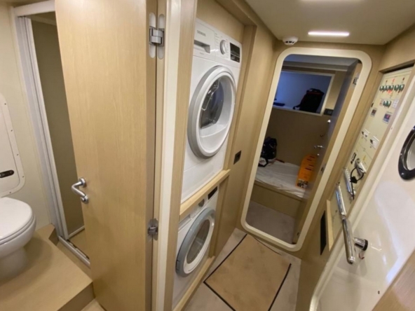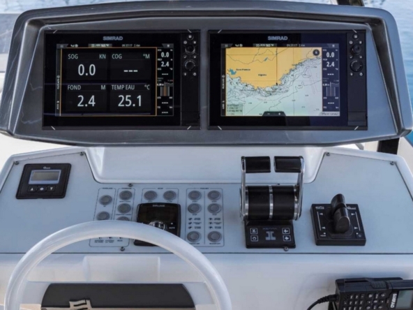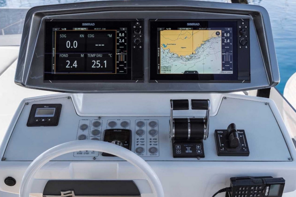 Bateau très bien équipé, incluant : Deux systèmes de stabilisation zéro-speed gyroscopique Seakeeper, propulseurs avant et arrière, système ‘Joystick Control’, deux générateurs Onan de 19 kW, climatisation tropicale réversible Condaria, électronique de navigation Simrad complète, dessalinisateur Idromar de 180 l/h, plateforme de bain hydraulique, annexe Williams Jet de 3,25 m, etc…