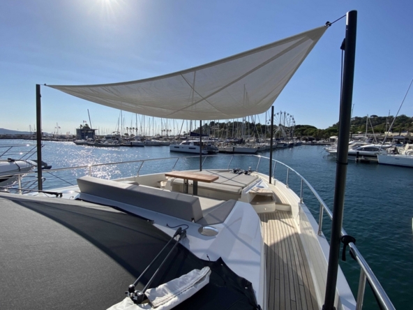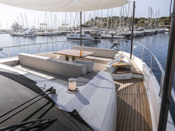 Un grand bain de soleil, avec dossiers orientables, et un salon portugais occupent le pont avant. Cette zone peut être ombragée avec un auvent tendu entre quatre poteaux en carbone.