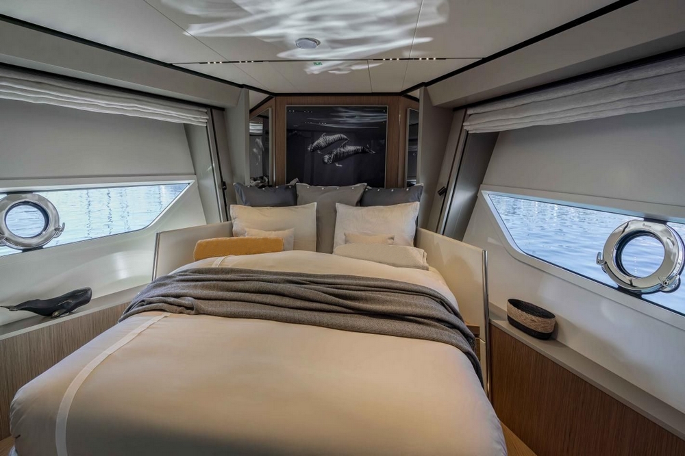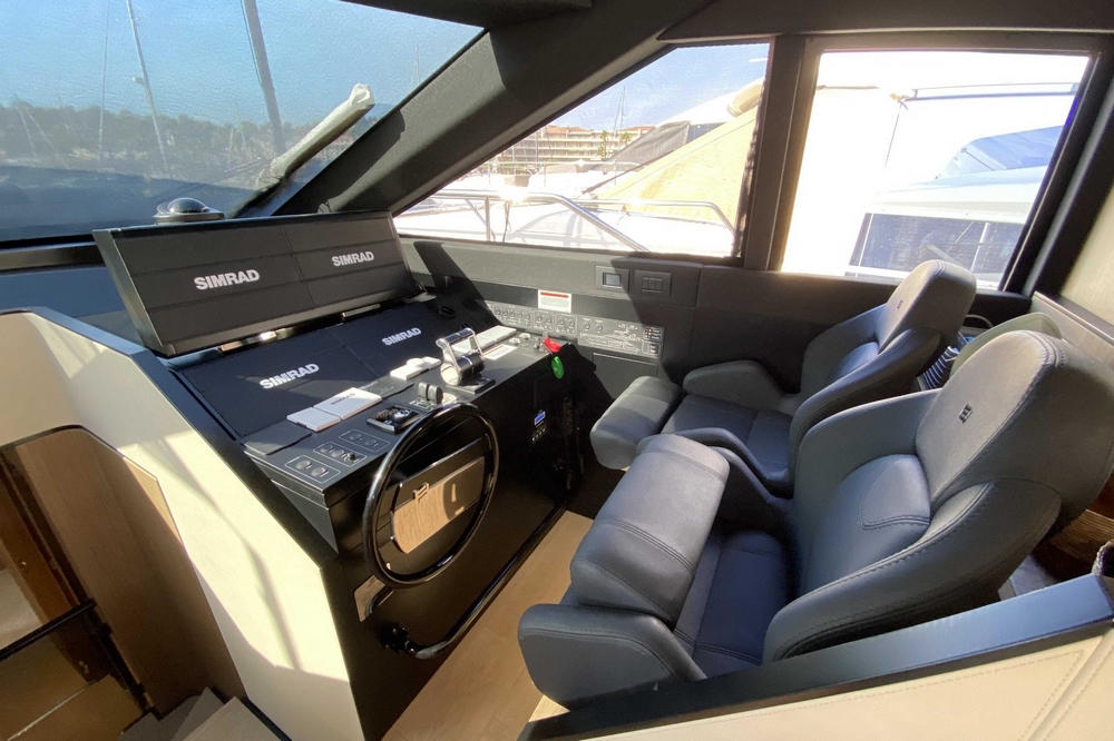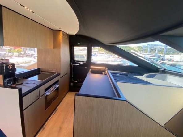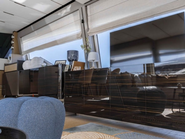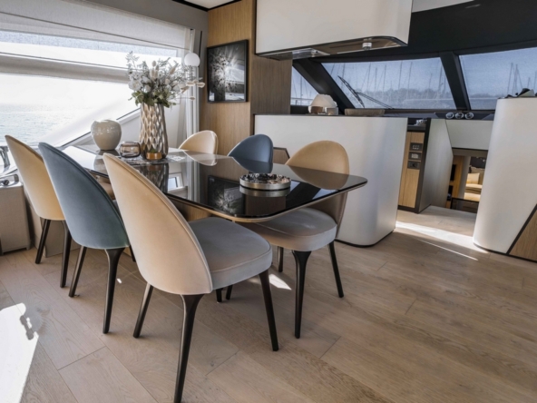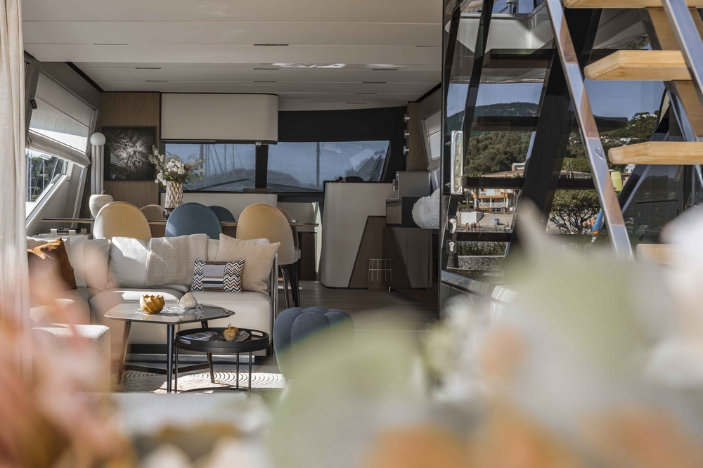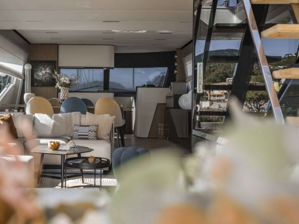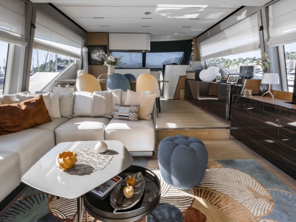 Une baie vitrée coulissante s’ouvrant sur toute la largeur du cockpit permet d’accéder à l’intérieur du pont principal. L’espace est totalement ouvert de l’entrée au poste de pilotage. Les aménagements luxueux sont baignés de lumière naturelle par les grandes fenêtres latérales.
