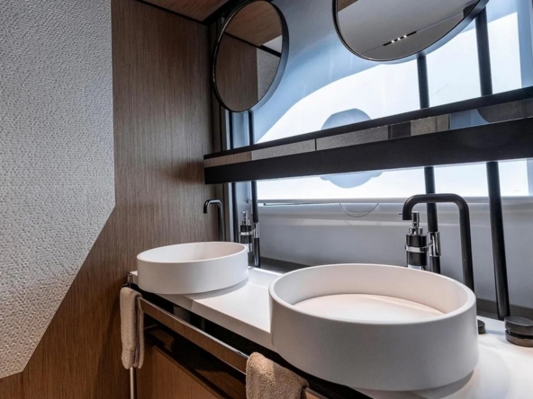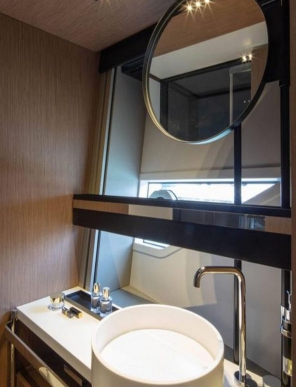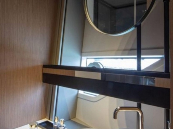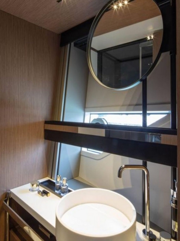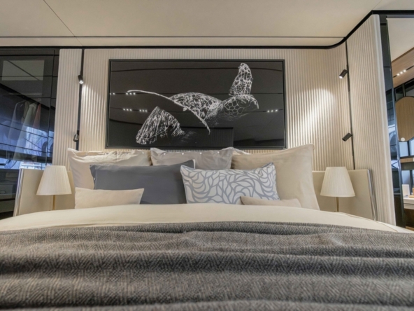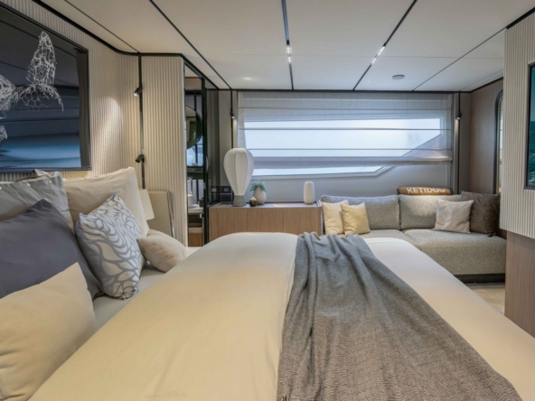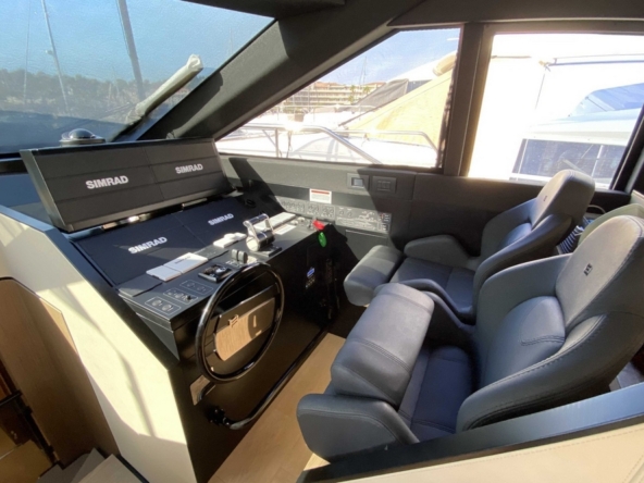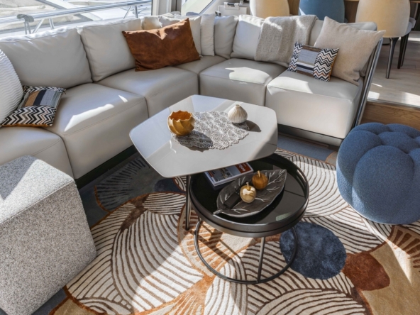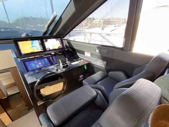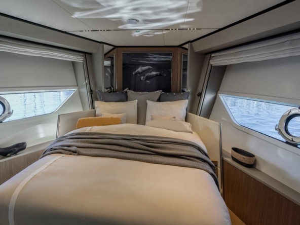 Une baie vitrée coulissante s’ouvrant sur toute la largeur du cockpit permet d’accéder à l’intérieur du pont principal. L’espace est totalement ouvert de l’entrée au poste de pilotage. Les aménagements luxueux sont baignés de lumière naturelle par les grandes fenêtres latérales.