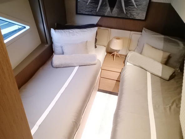 . La cabine invités avec lit double est à l’avant, avec placards, et salle de bain attenante.