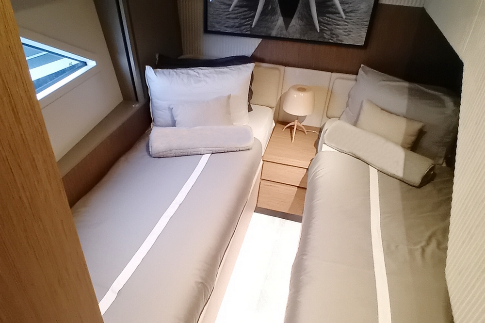 Le pont inférieur, accessible par un escalier situé entre la cuisine et le poste de pilotage, est dédié aux cabines :