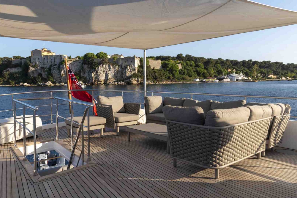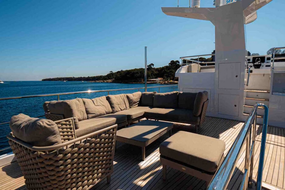 Sur le pont avant, une banquette fait face aux guindeaux et aux deux jet skis manœuvrables par une grue hydraulique Opacmare des 1.200 kg.