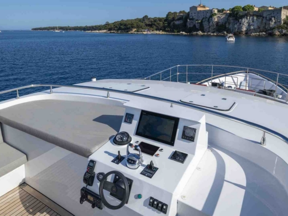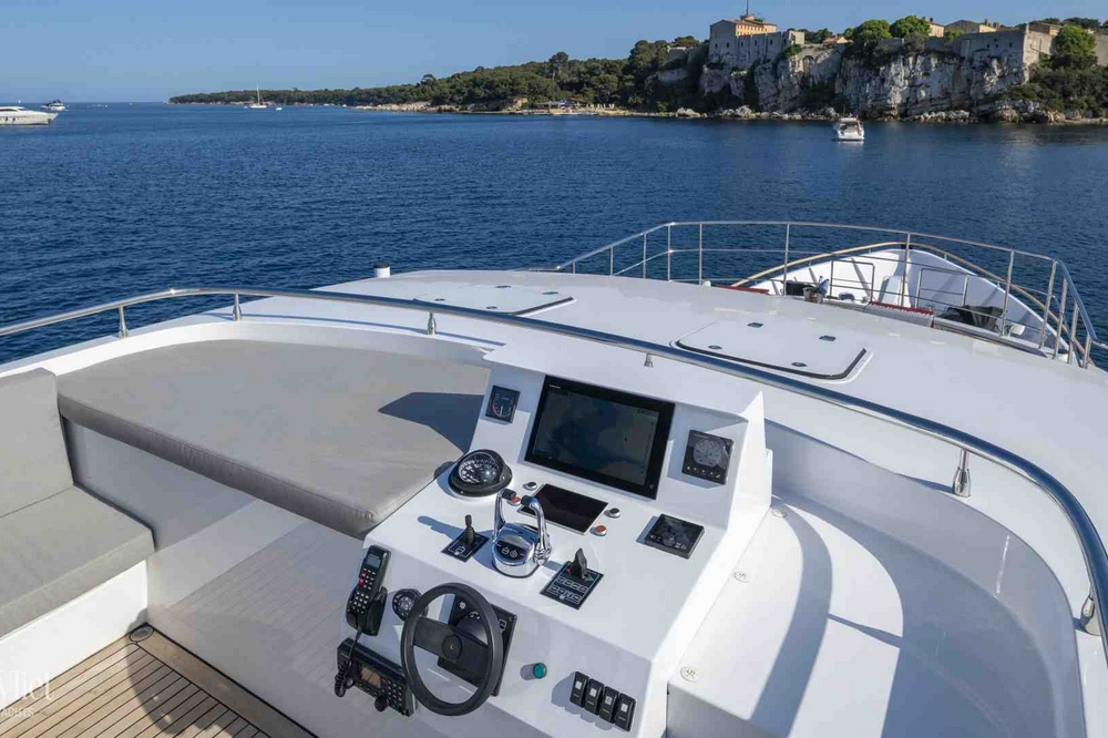 Bateau très bien équipé, avec : Système de stabilisation en route Naiad, propulseur d’étrave Naiad de 46 kW, deux générateurs Kohler de 35 kW et 28 kW, système de climatisation réversible Webasto de 144.000 BTU, dessalinisateur Echo Tech de 240 l/h, grande plateforme de bain avec annexe Highfield de 4,60 m et 70 cv, jouets nautique (2 jet-skis Sea-Doo Spark, 2 kayaks, 2 paddles gonflables, ski nautique, wakeboard, bouée tractée, équipement de plongée), etc…