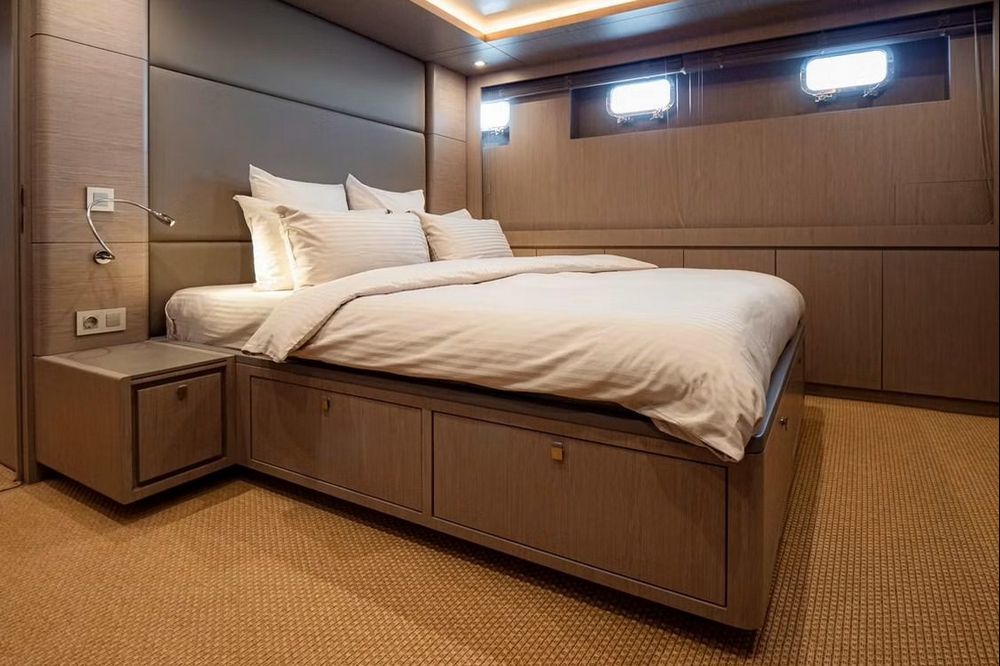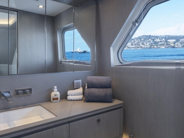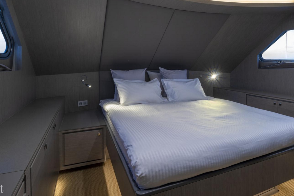 . A l’arrière, la bazarette jouxte une cabine invités équipé de lits jumeaux, d’une banquette, et d’une grande penderie.