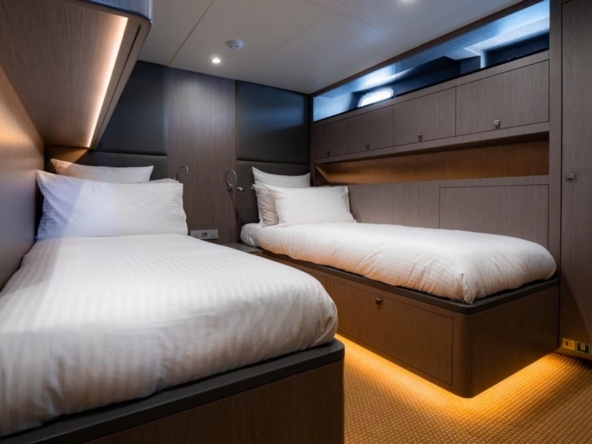 . La zone avant est dédiée à la deuxième cabine invités avec lits jumeaux et au quartier de l’équipage. Celui-ci comporte