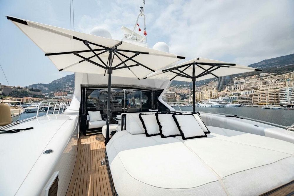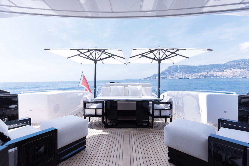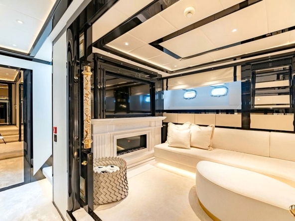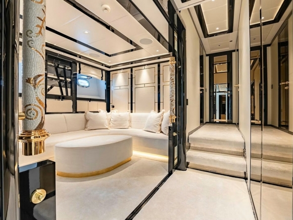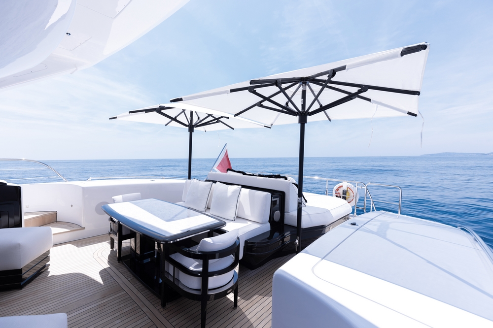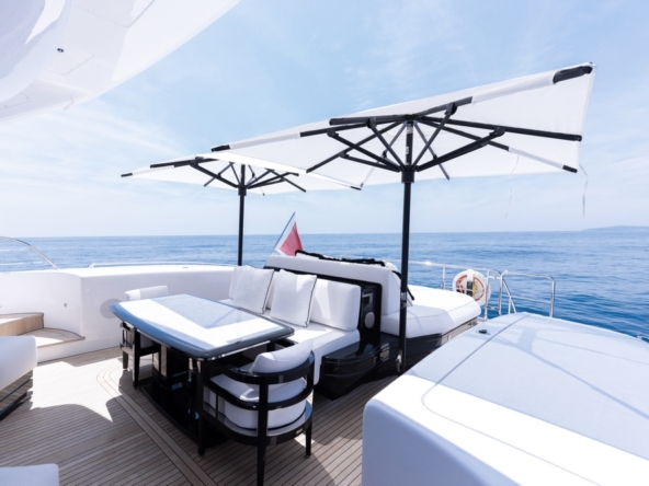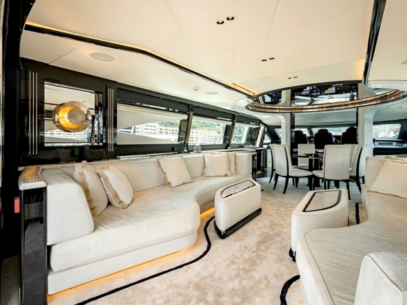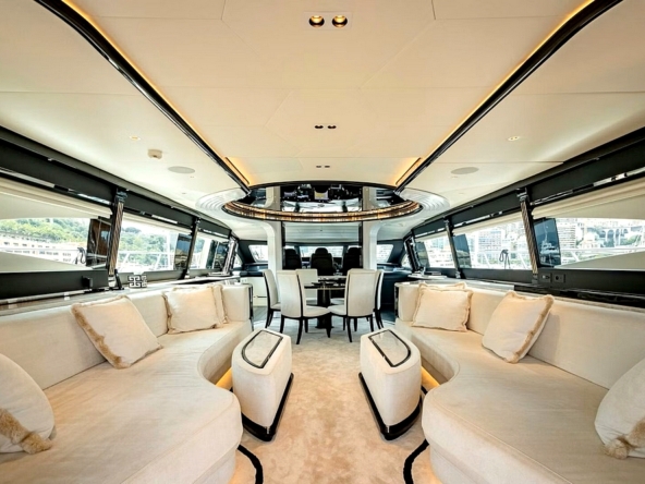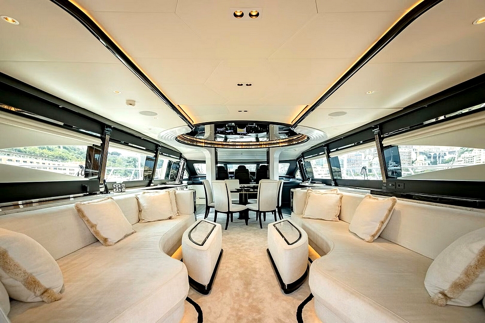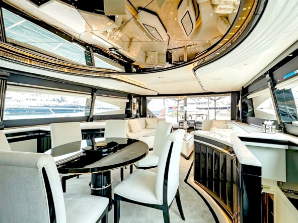 Une large baie vitrée coulissante permet d’accéder à l’intérieur du pont principal. L’aménagement sophistiqué, moderne, luxueux, et raffiné, signé par Sturge Toth, procure une ambiance très conviviale. Ce grand espace entièrement ouvert de l’entrée à la timonerie, est mis en valeur par la luminosité diffusée par les grandes fenêtres latérales et le pare-brise.