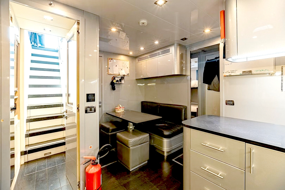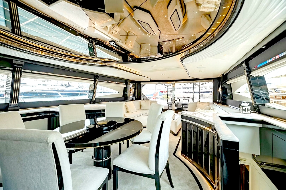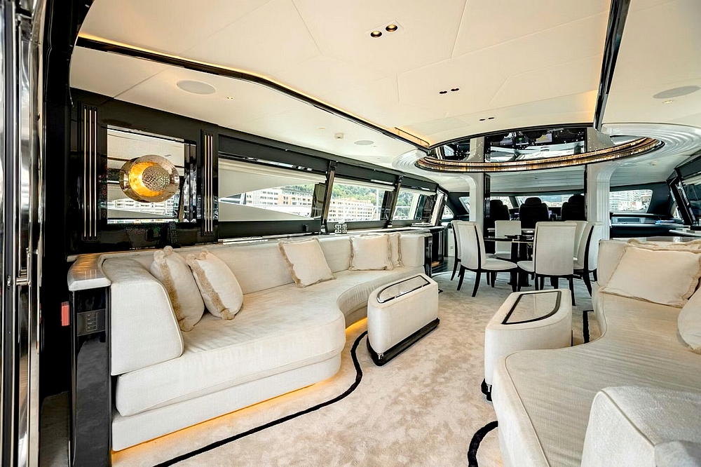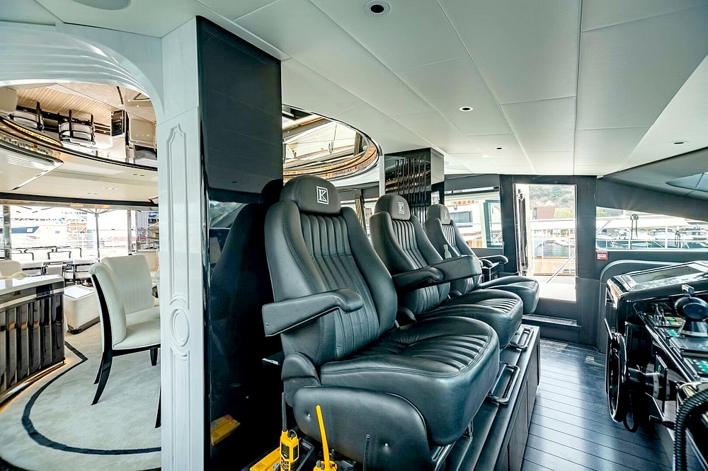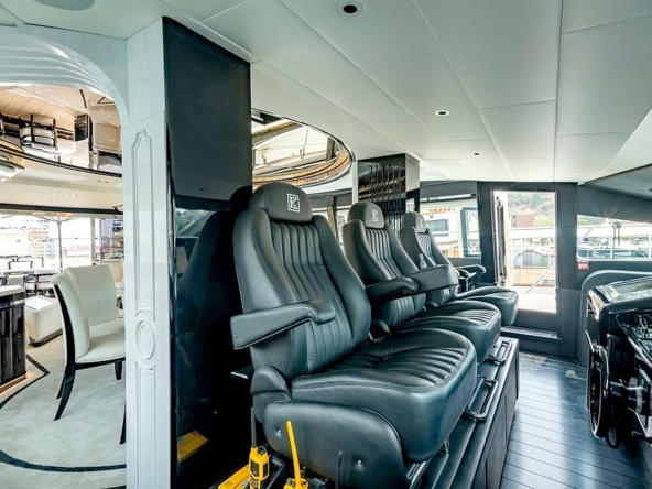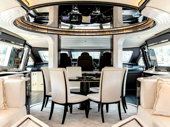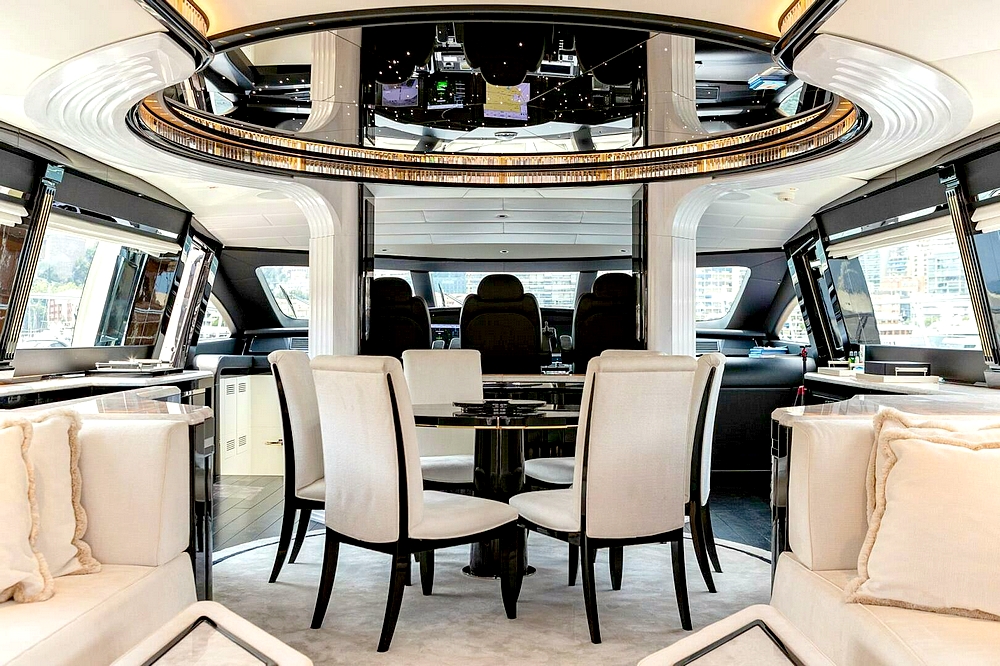 Le vaste salon occupe toute la largeur à l’entrée. Il est divisé en deux canapés symétriques devant deux tables basses. En avant, la salle à manger centrale, sous une coupole couronnée par un miroir de plafond avec une constellation d’étoiles en fibre optique, est constituée d’une table ronde entourée par six chaises. Le poste de pilotage est impressionnant. Il s’étend sur toute la largeur avec son imposante console à instruments, son petit volant, et ses trois confortables fauteuils de barre.