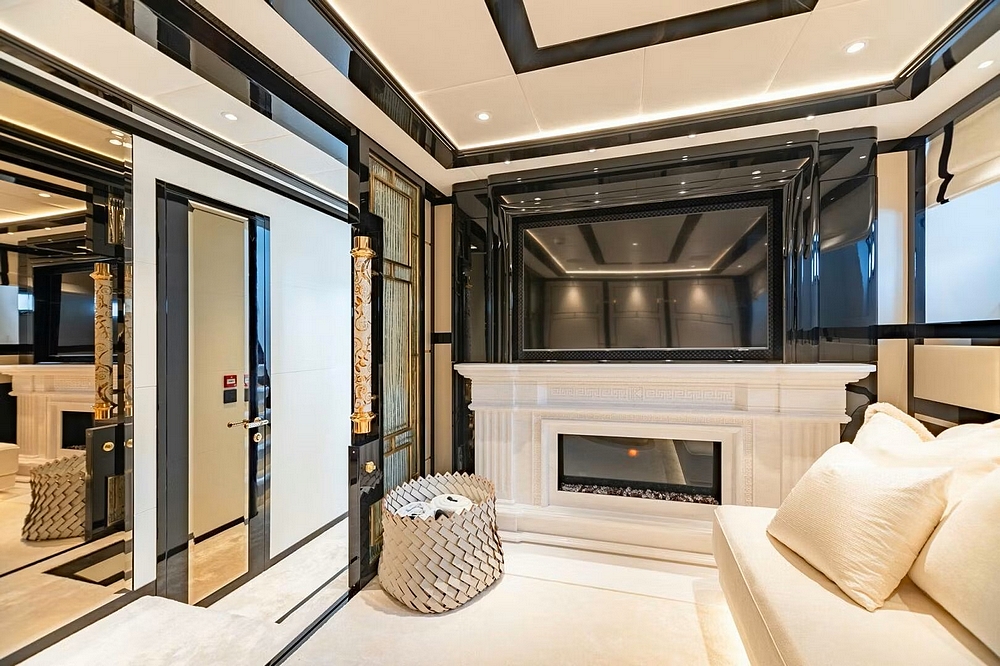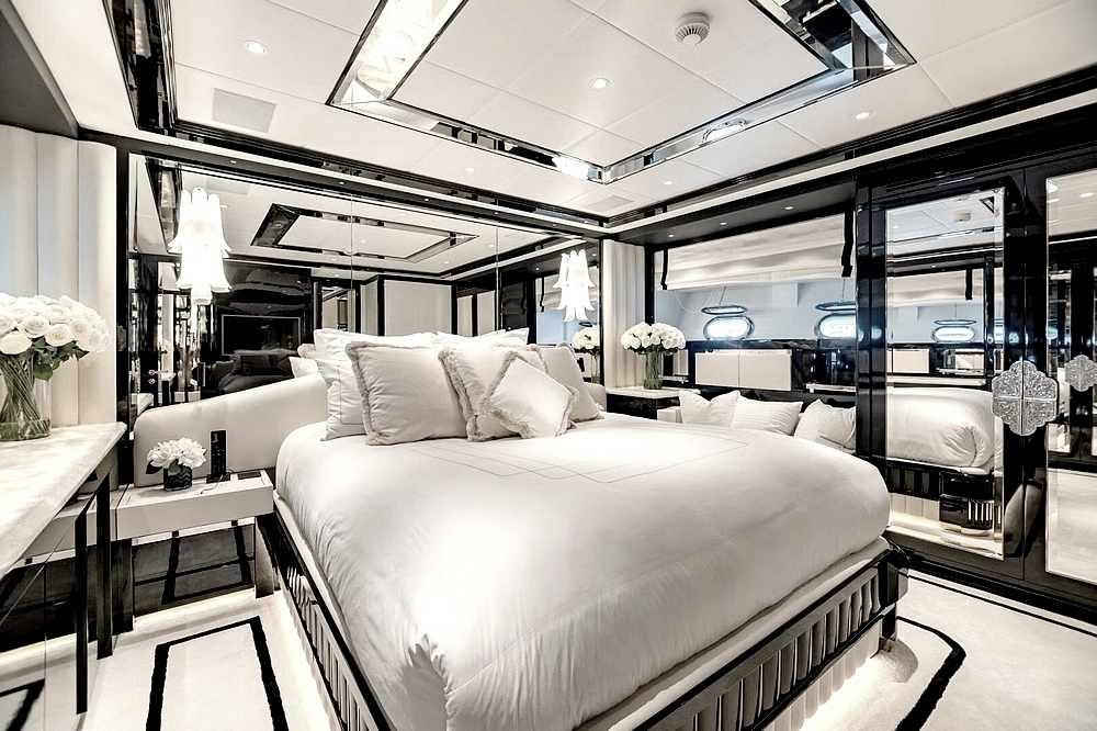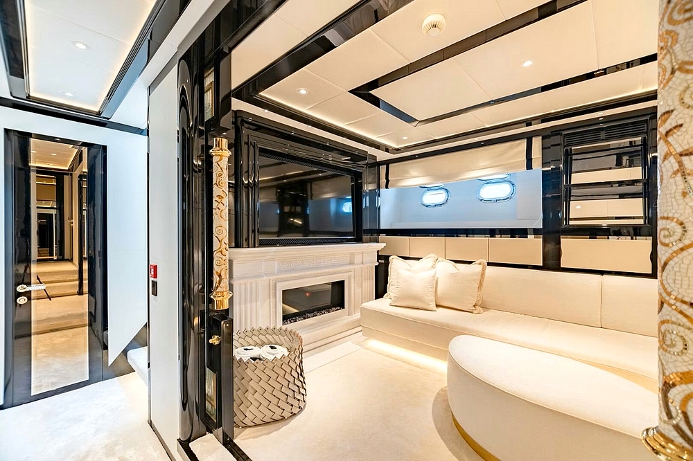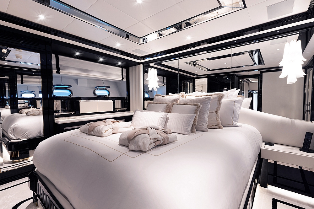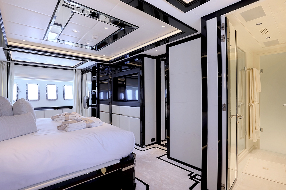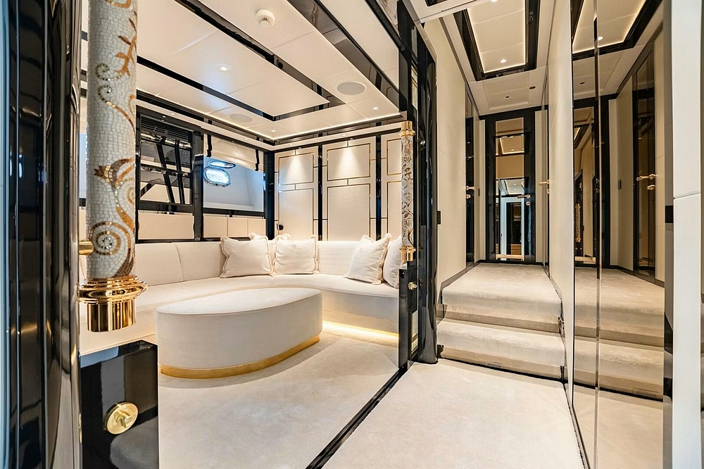 Le vaste salon occupe toute la largeur à l’entrée. Il est divisé en deux canapés symétriques devant deux tables basses. En avant, la salle à manger centrale, sous une coupole couronnée par un miroir de plafond avec une constellation d’étoiles en fibre optique, est constituée d’une table ronde entourée par six chaises. Le poste de pilotage est impressionnant. Il s’étend sur toute la largeur avec son imposante console à instruments, son petit volant, et ses trois confortables fauteuils de barre.