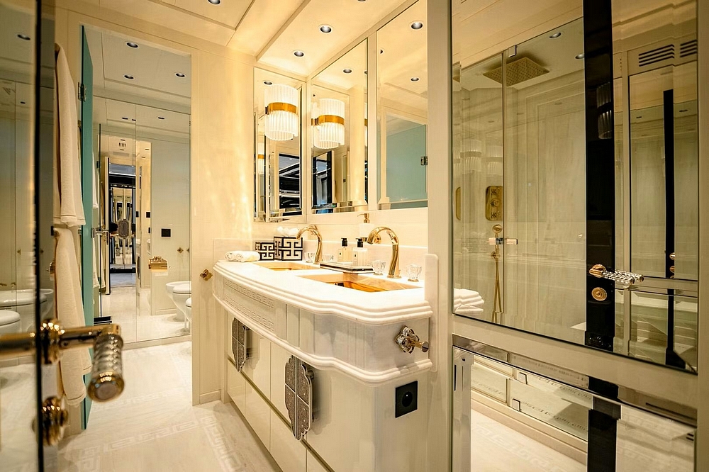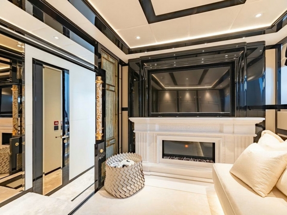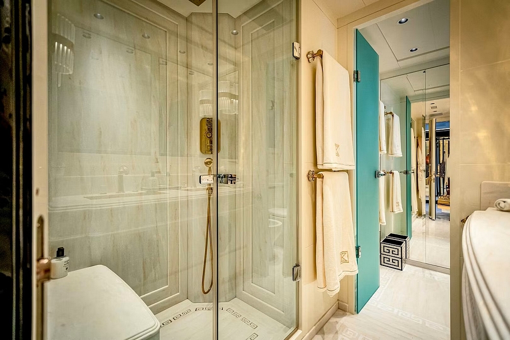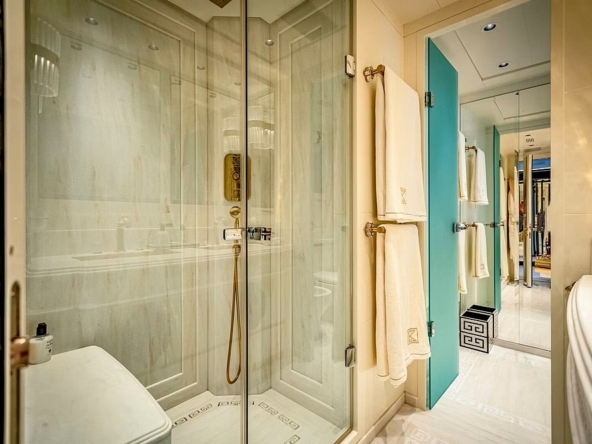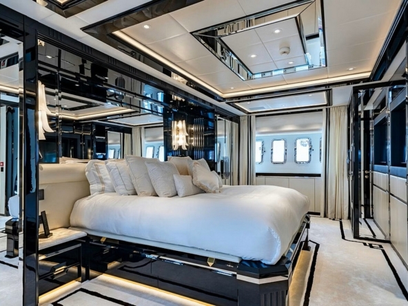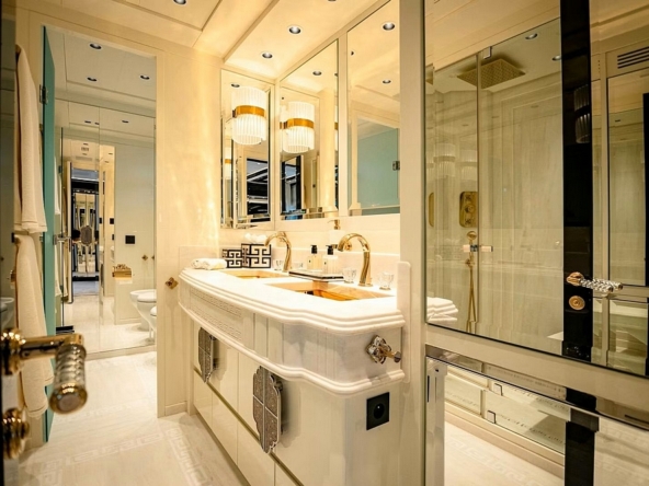 équilibrés par des surfaces en onyx noir brillant, créant des reflets de lumière élégants. La suite du propriétaire