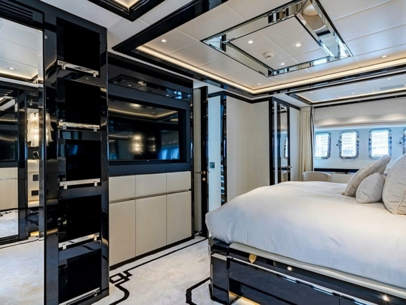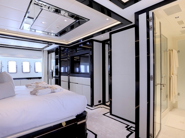 occupe toute la largeur au milieu du bateau. Elle est aménagée avec un lit king-size et un fauteuil. La suite VIP