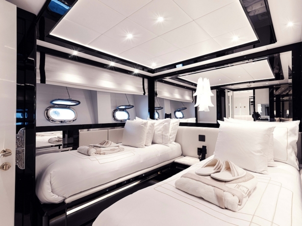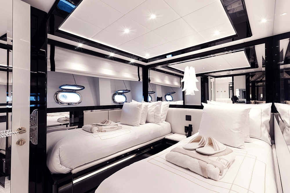 Il peut accueillir 6 personnes dans 3 cabines et 4 membres d’équipage dans 2 cabines.