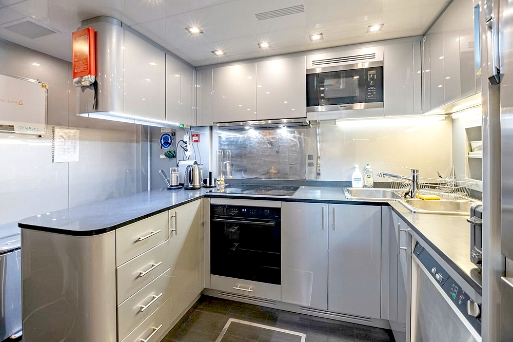 deux cabines d’équipage avec lits superposés et salle de bain, le mess, la buanderie avec lave-linge et sèche-
