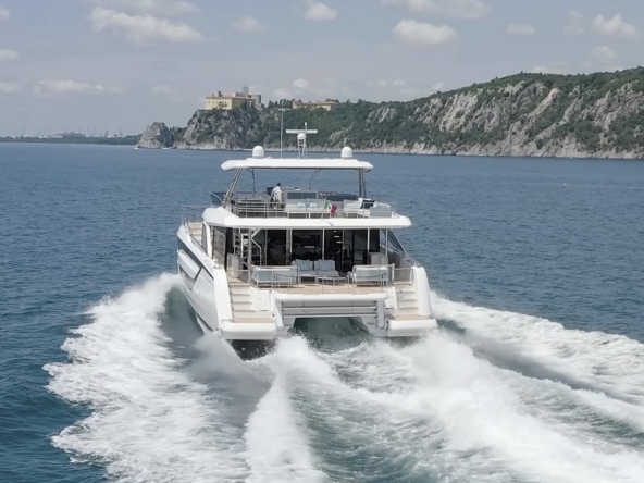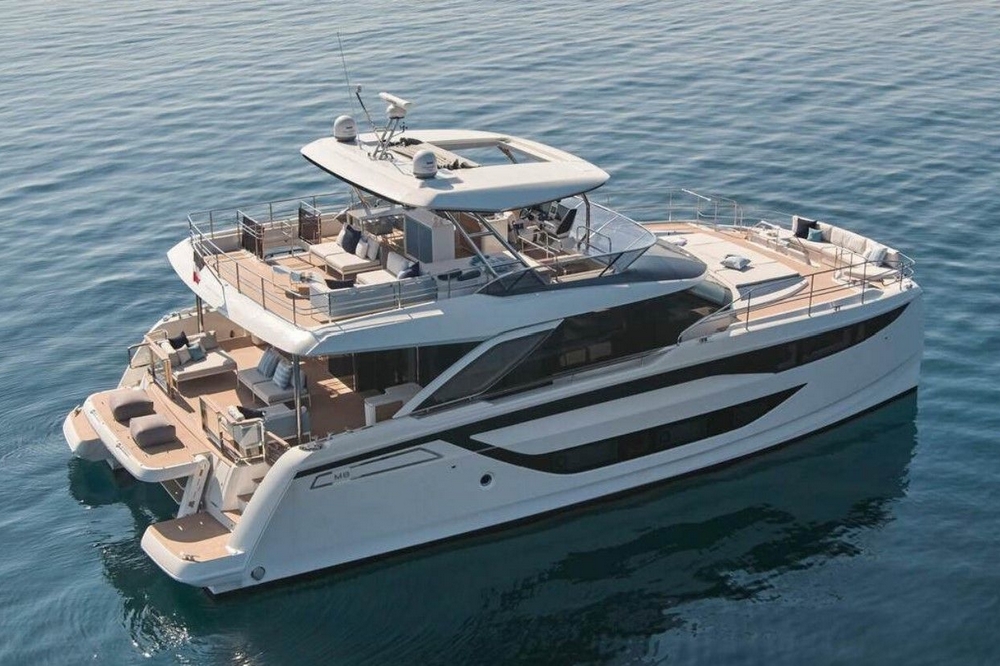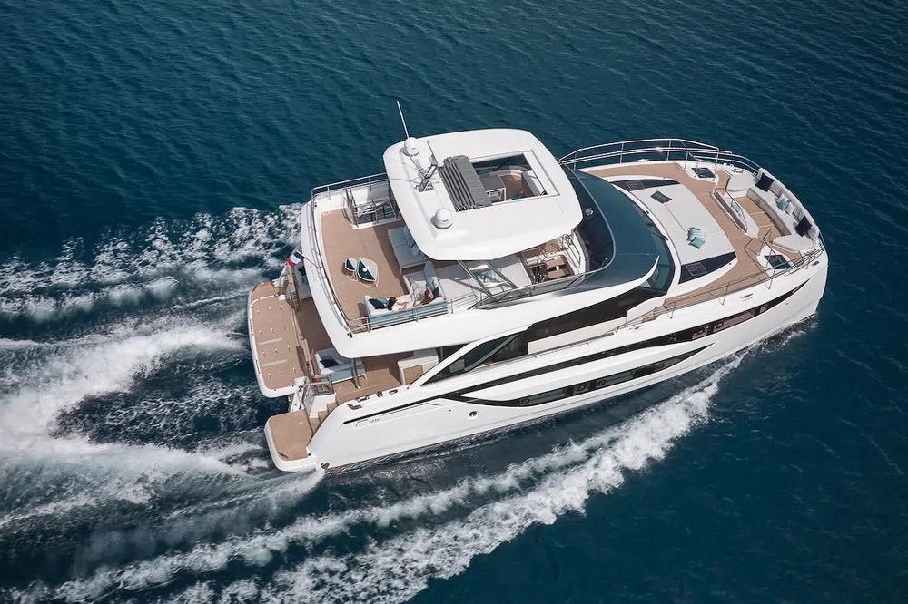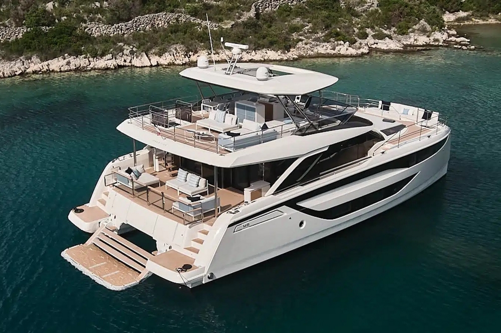 Catamaran à moteur exceptionnellement confortable. Ce M8 est une véritable villa sur la mer. Ses lignes contemporaines, conçues par l’architecte Marc Lombard, sont pures et élégantes. Il a été construit en polyester par le chantier naval Prestige du groupe Beneteau Italia, alliant la maîtrise technique française et le design italien. La configuration multicoque offre une grande stabilité aussi bien au mouillage qu’en navigation. Il a une parfaite tenue par mer formée et une consommation de carburant réduite (deux fois moins de carburant qu’un monocoque ayant la même surface habitable). L’espace de vie est immense : 50 m² de flybridge, 30 m² de cockpit, 50 m² de salon, 30 m² pour la suite propriétaire, etc… près de 270 m² au total !