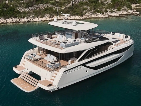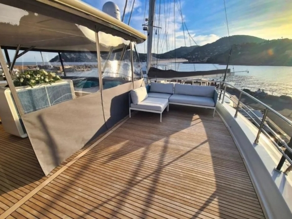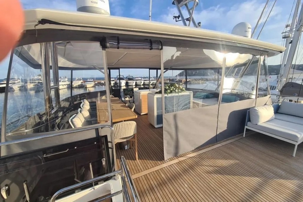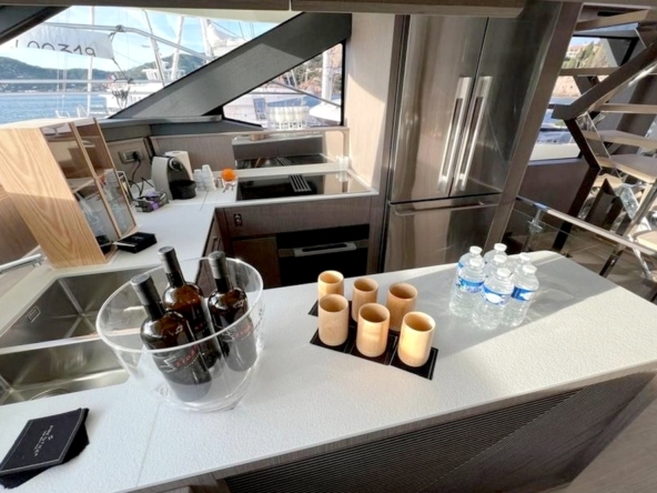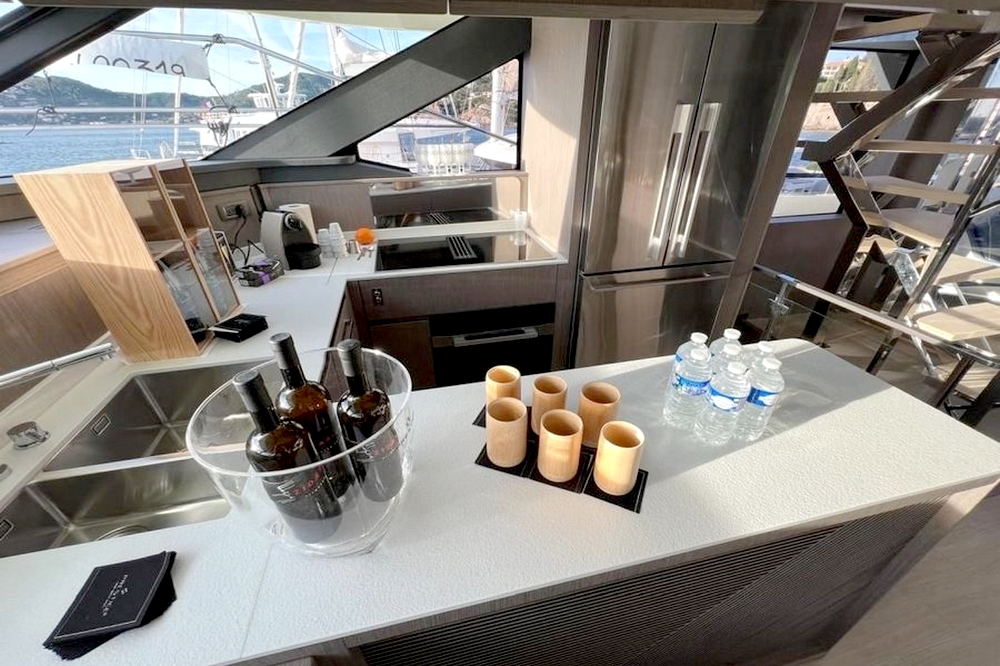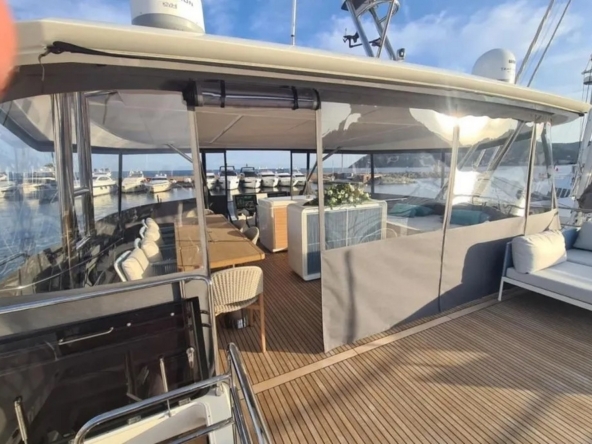 Ce bateau est entièrement équipé, avec : Propulseurs d’étraves, générateur Mase de 22 kW, pack de batteries au lithium et panneaux solaires, climatisation tropicale réversible, électronique de navigation Garmin complète, système de communication par satellite Starlink, dessalinisateur de 280 l/h, passerelle hydraulique, plateforme de bain extensible, etc…